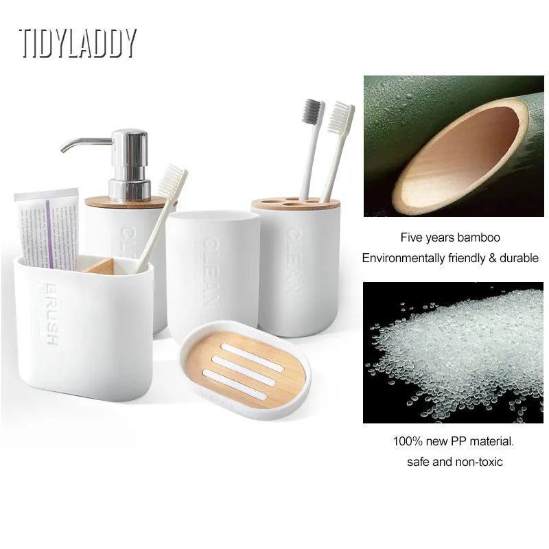 Изготовлен из полипропиленового материала, экологически чистый и здоровый. Украшенный бамбуком и деревом, натуральный, элегантный и со вкусом. Держатель туалетной щетки: щетка с бамбуковой ручкой и ПП держатель основания. Герметичный дизайн, запах не подвержен воздействию. Мыльница: бамбуковые деревянные поддоны могут быть вывезены. Полый дизайн с функцией слива. Дозатор мыла: гладкие и гладкие насадки подходят для вашей ладони. Держатель зубной пасты: встроенная бамбуковая перегородка для разделения зубной пасты и зубной щетки. Бамбуковая перегородка может быть вывезена. Держатель зубной щетки: четыре части дизайна для зубной щетки до 4. Бамбуковая перегородка может быть вынута, затем держатель зубной щетки может использоваться в качестве чашки.