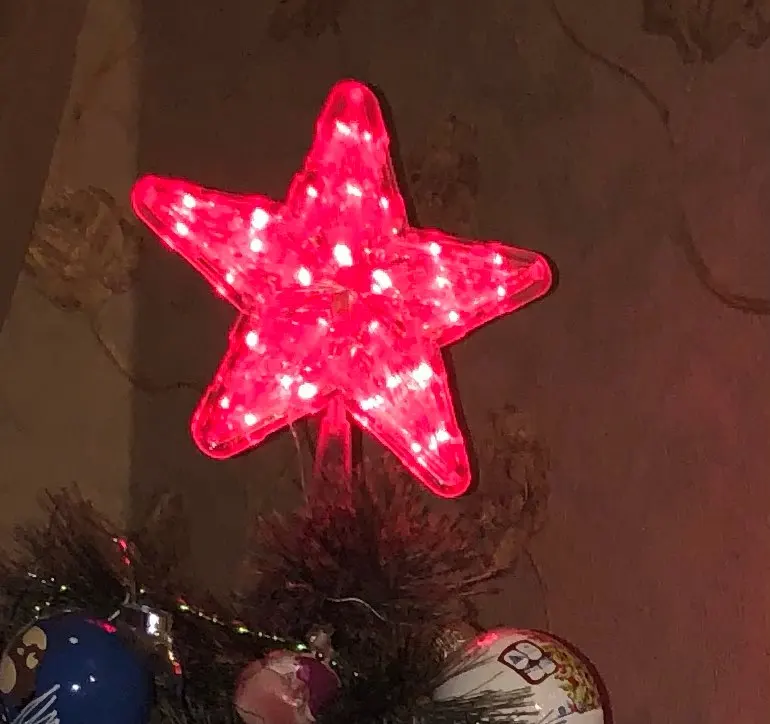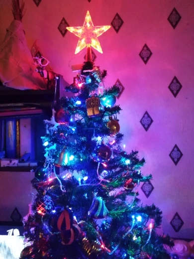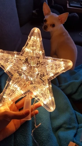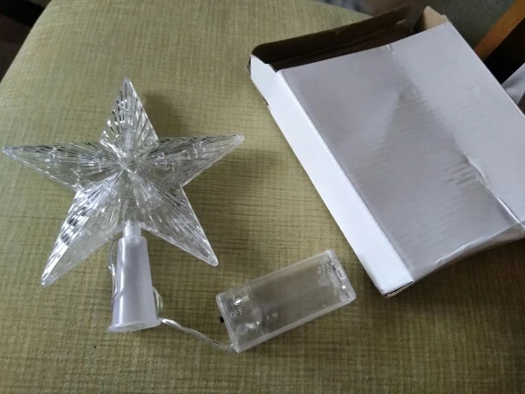 Приятно, но жаль, что кабель питания слишком короткий (около 40 см), чтобы звезду надеть поверх ели (даже маленький! ). Поэтому пришлось положить Удлинительный шнур в дерево... Но сама звезда имеет небольшой эффект.