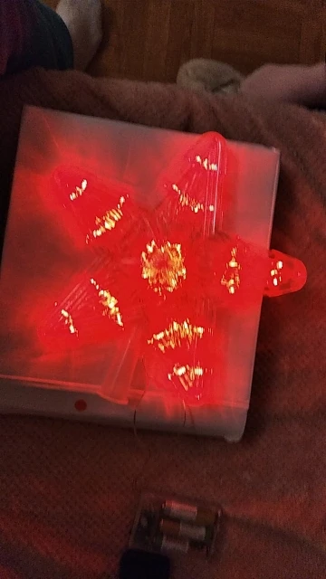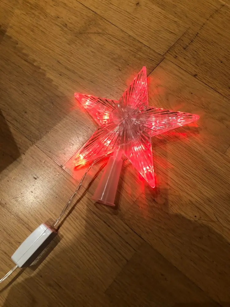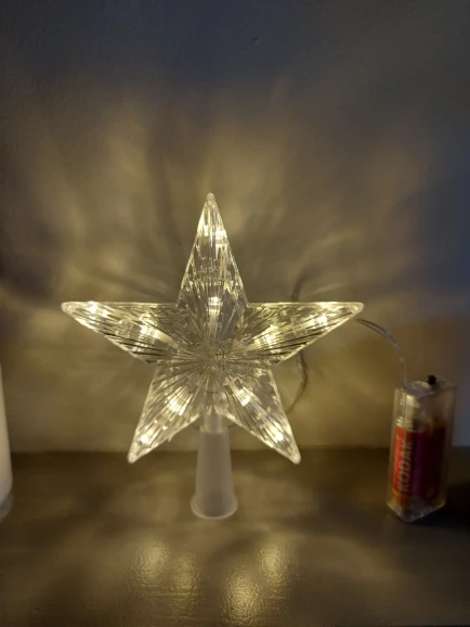Звезда из пластика, внутри лампочки красного света. Часть не горела, видно на фото. Пластик очень хлипкий, шнур до ящечка с батарейками около 15 см, очень короткий. Пару раз открыла крышку поставить батарейки, уже трещина. Звезда одноразовая