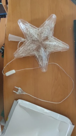 звезда доставлена в коробке, обернутой пупыркой. не разбита, целая, пластиковая, лёгкая, горит. но: в 10 см от звезды - адаптер, через 60 см - вилка. общий шнур ~80 см. видимо, удлинитель нужно прям на елку вешать((