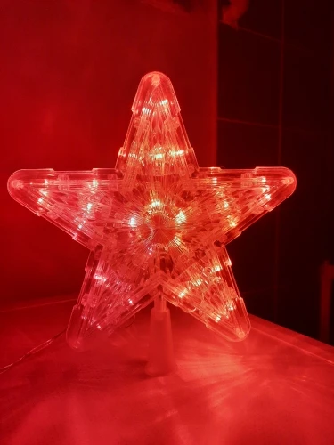 Сама звезда из прозрачного оргстекла. При заказе я думал, что она из красного оргстекла. И ещё она не мигает, а горит постоянным диодным красным светом.