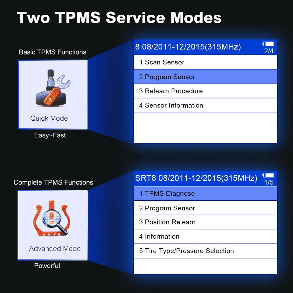 Быстрый режим TPMS: Основные функции TPMS для быстрой проверки датчиков TPMS и программирования mx-датчиков;Расширенный режим TPMS: Выполните функции TPMS для проверки датчика, диагностику TPMS, программу mx-датчика и положение датчика.