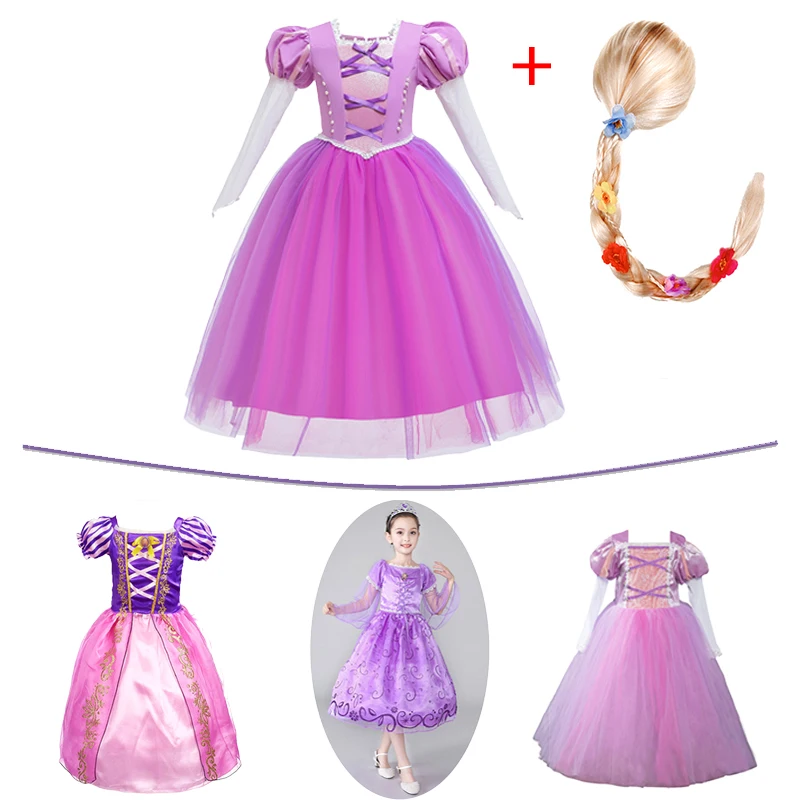 Платье Рапунцель; Платье для девочек; Детский костюм для костюмированной вечеринки; Костюм принцессы; Детский карнавальный костюм на день рождения, вечерние, одежда розового цвета, аксессуар парик