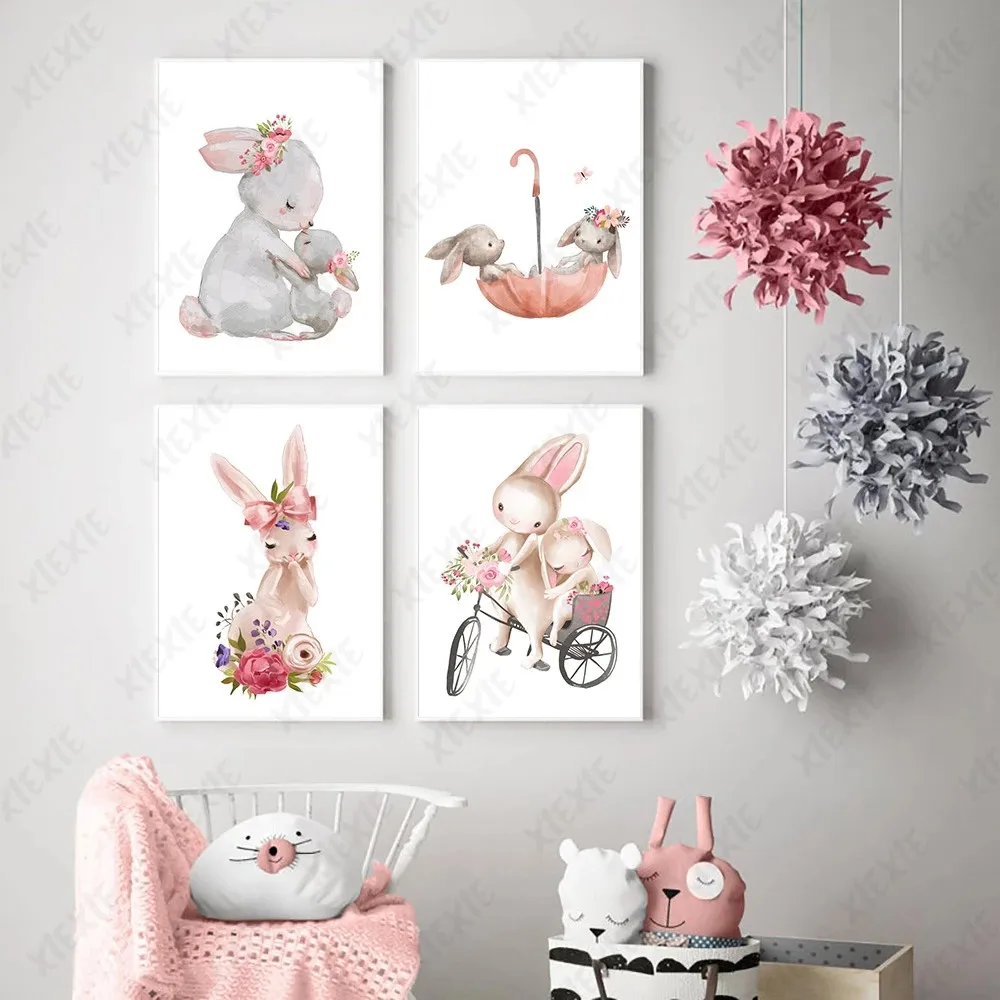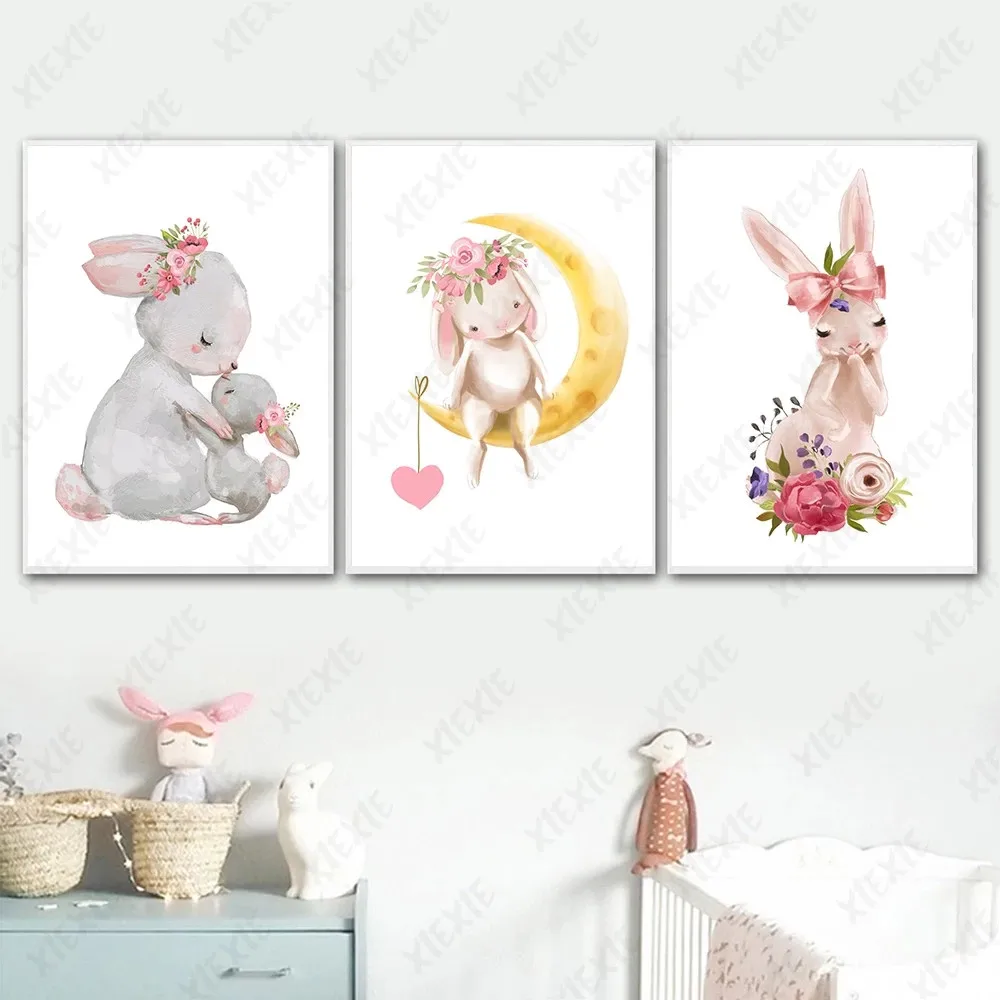 Постер с мультяшными детскими животными и воздушными шарами, милый кролик, луна, украшение для дома, Картина на холсте, картины, настенное искусство для детской комнаты