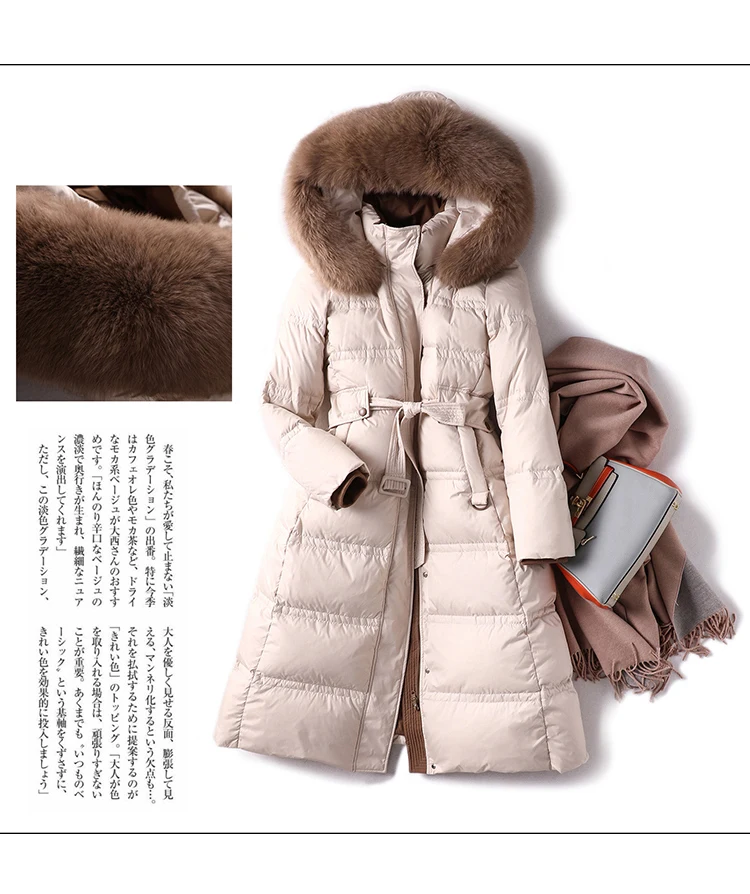 Женский пуховик с мехом лисы, 90% белый утиный пух, длинные пальто на молнии с широкой талией, новинка 2020