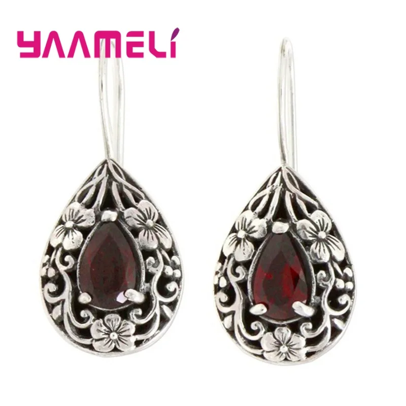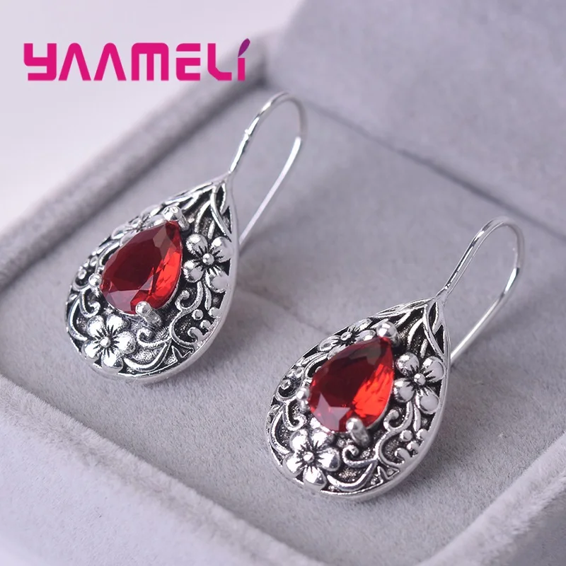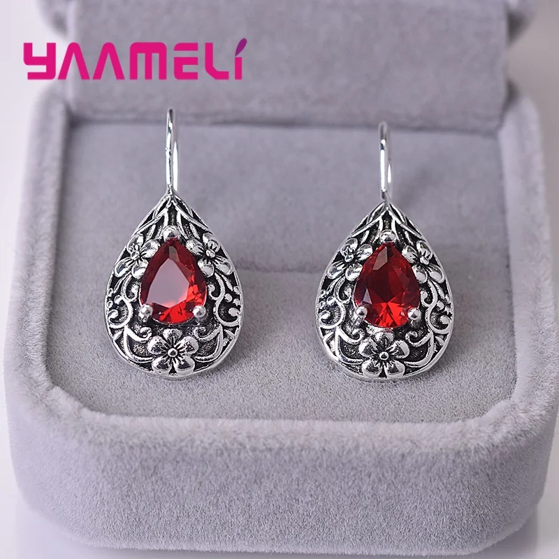 Ретро дворец Королевский Стиль в виде капли воды, в виде капель с кристаллами в форме Для женщин под старину 925 пробы серебро красные циркониевое цветочное резьба Pendientes