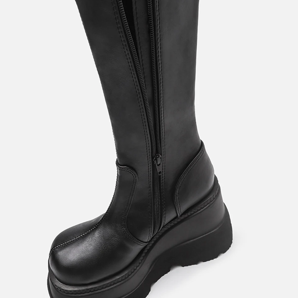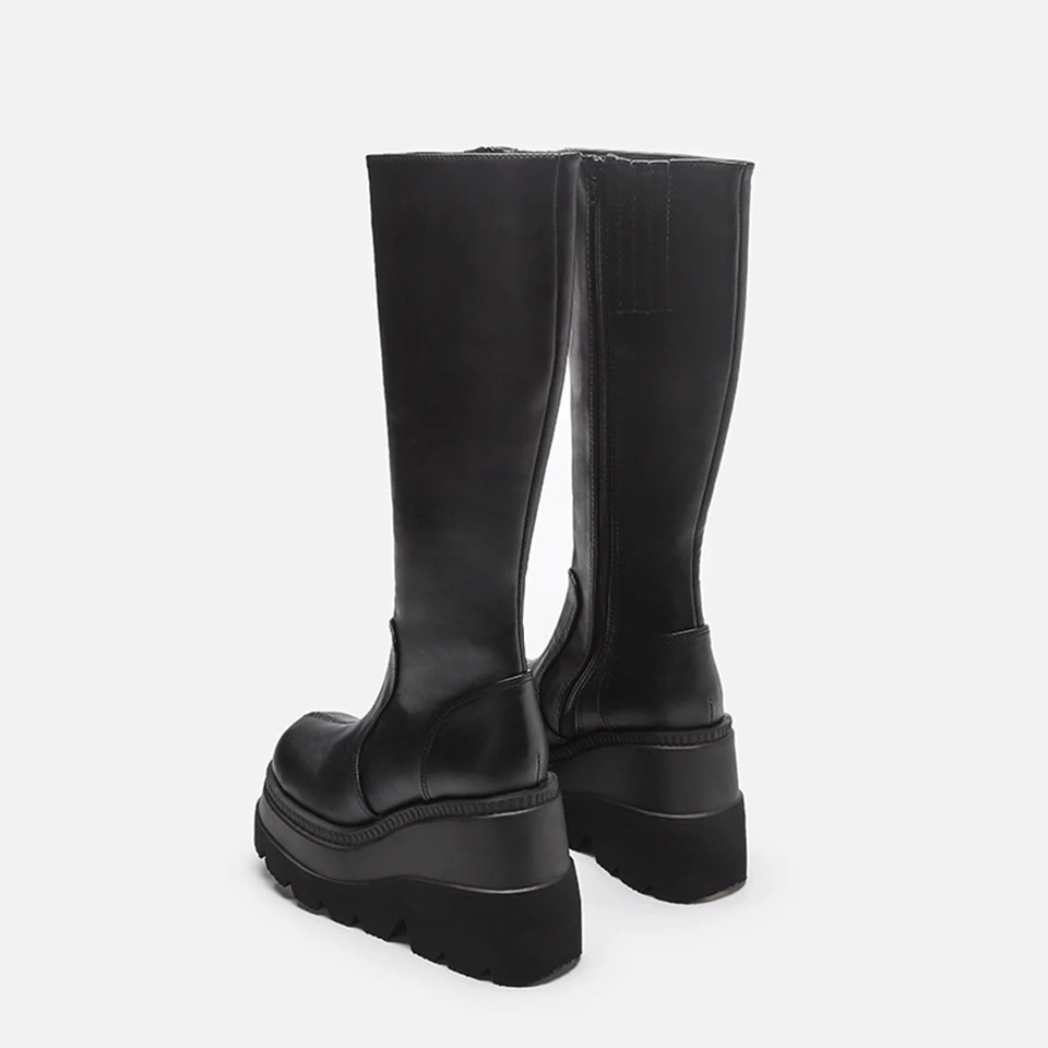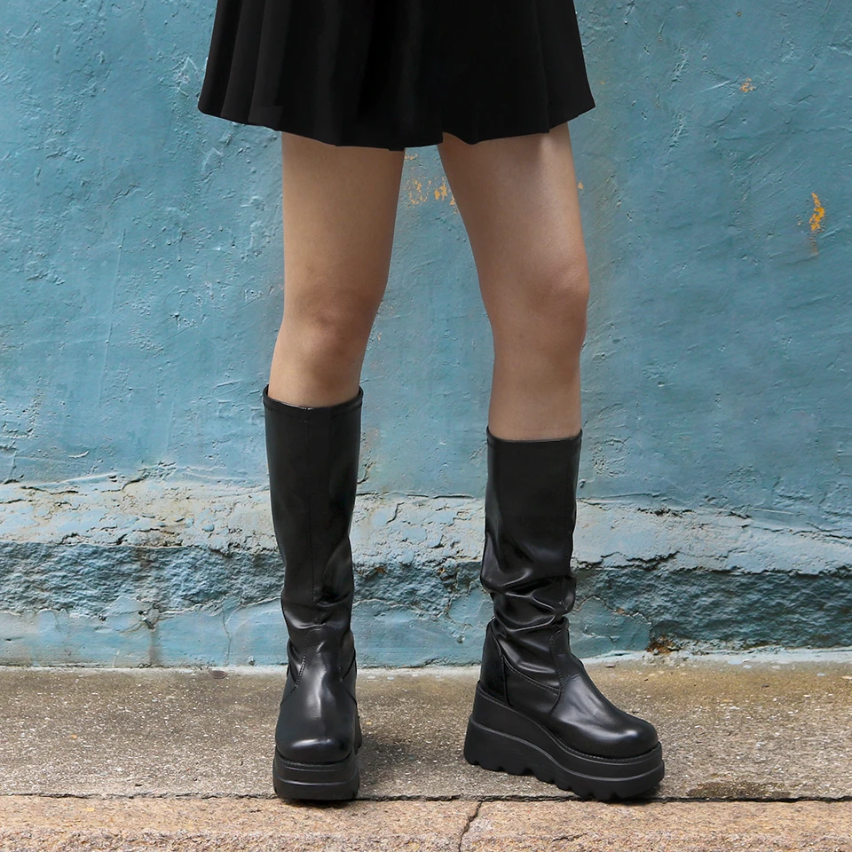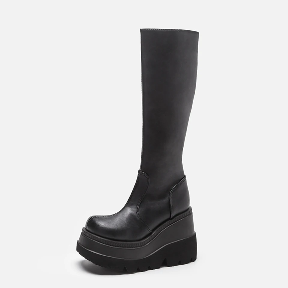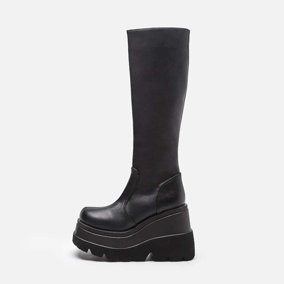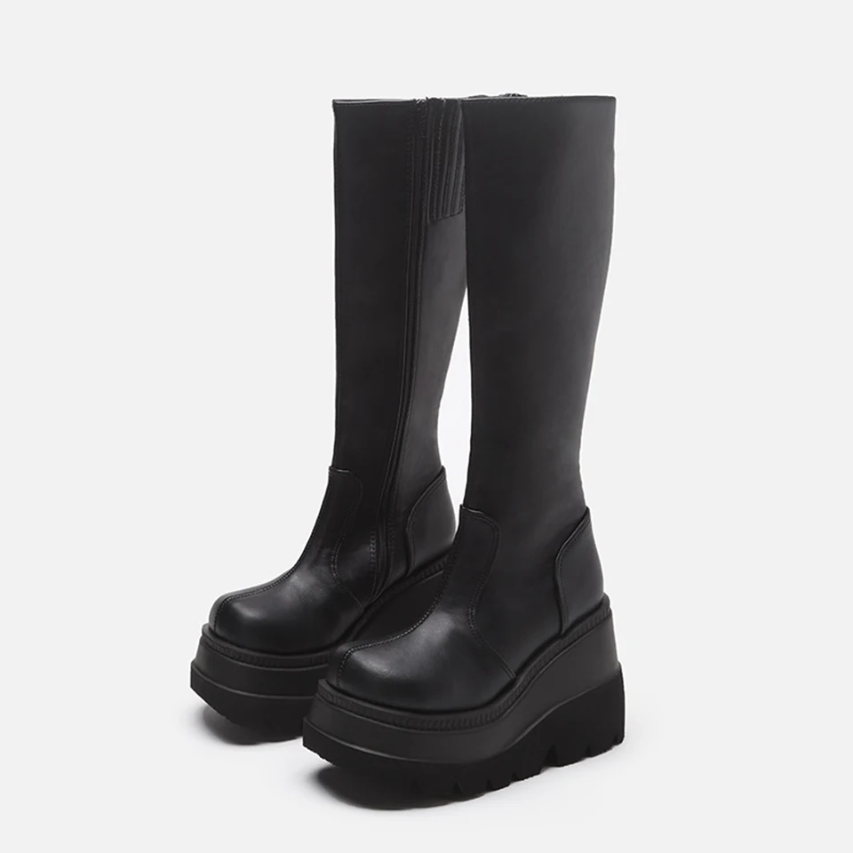 Женские ботинки на высокой танкетке, на молнии, до середины икры