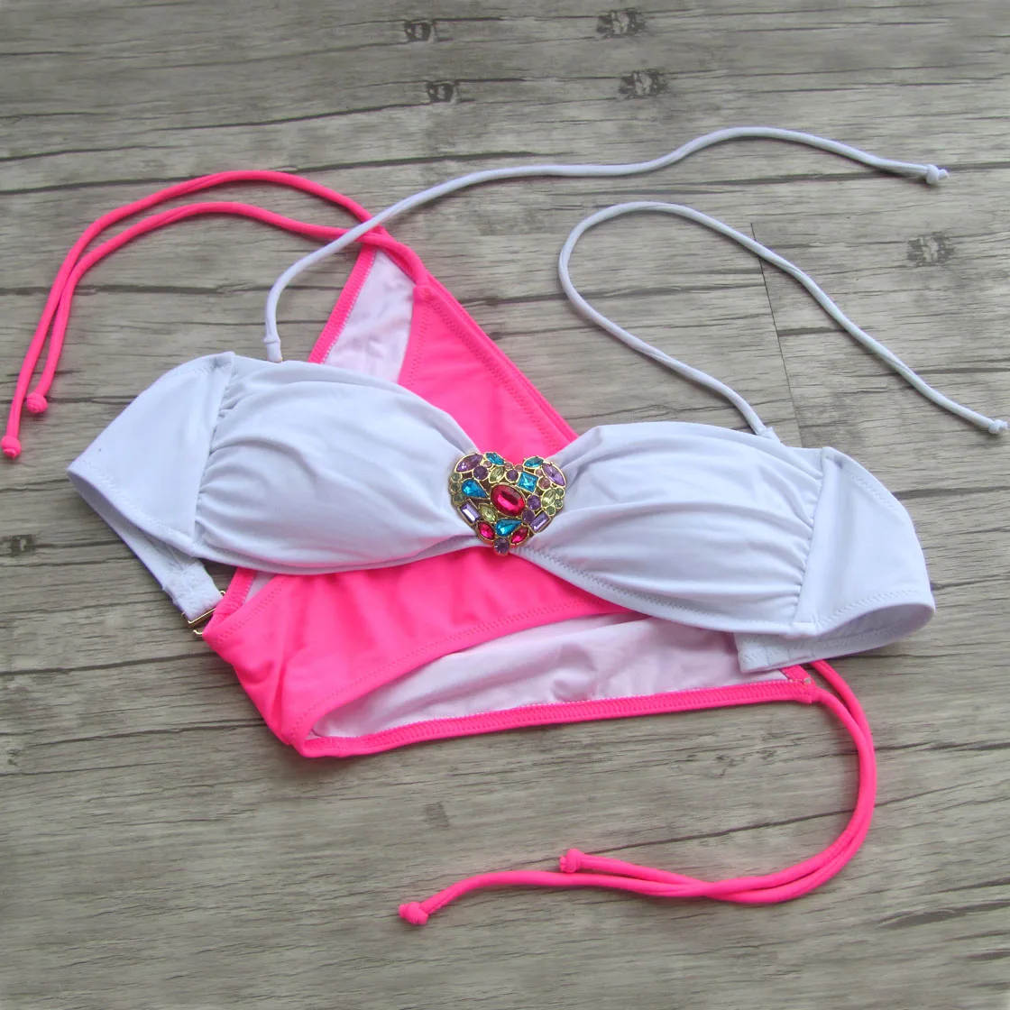 Дизайнерский комплект бикини для девушек в форме сердца с кристаллами и бриллиантами, белый купальник, женский купальник, бикини с розовым низом, купальный костюм
