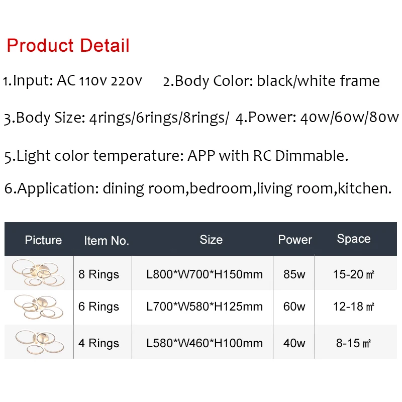 Вход: AC110V/220VЦвет корпуса: черный/белыйРазмер лампы:4 кольца/L58 * W46 * H10 см Мощность: 40 Вт пространство: 8-15 м26 колец/L70 * W58 * h12.5см мощность: 60 Вт пространство: 12-18m28 колец/L80 * W70 * H15 см Мощность: 85 Вт пространство: 15-20 м2Материал: алюминиевый ПВХ металлЦветовая температура лампы: приложение с регулируемой яркостью RCДоставка из: Китая и России, CZГарантия: один год