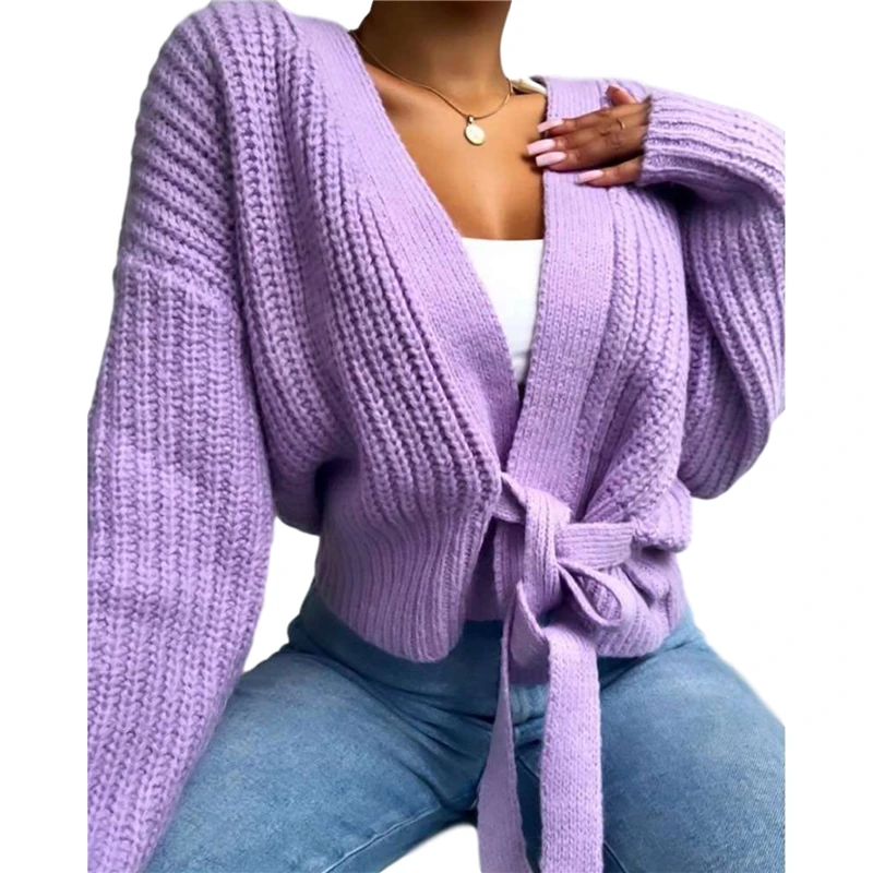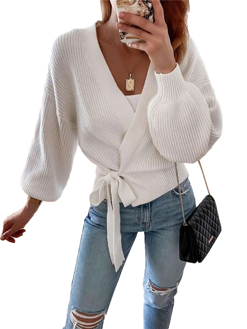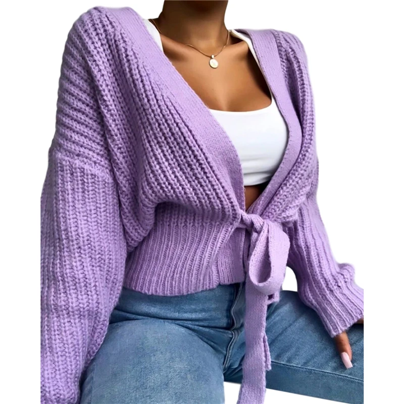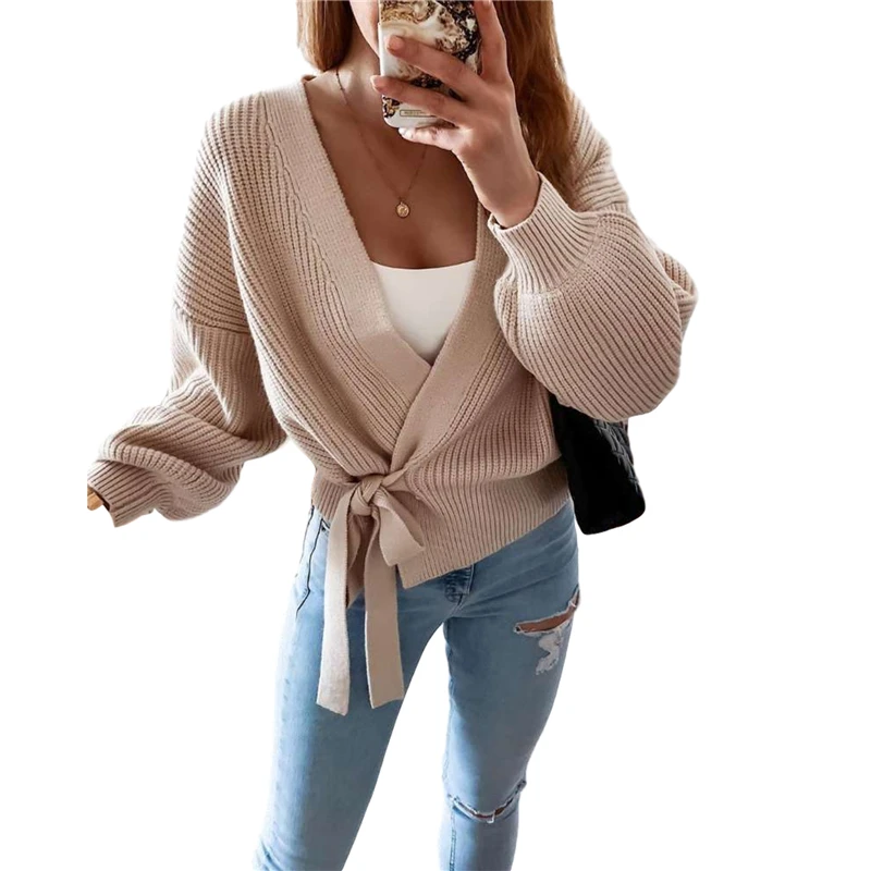 Женский свитер с V-образным вырезом, однотонный кардиган на шнуровке с бантом, Женское пальто, белый, фиолетовый, серый, абрикосовый