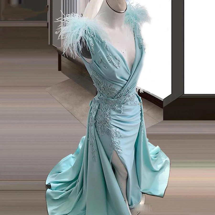 Abendkleider 2021 Русалка мятно-зеленого цвета платье для выпускного вечера с расширенным съемным подолом, сексуальные высокие сбоку Разделение длинное вечернее платье со вставкой из кружева с бисером и перьями