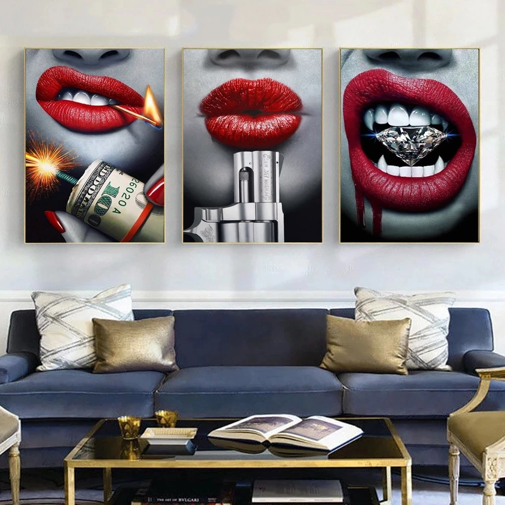 Кроваво-красная помада сексуальные губы с пистолетом и деньгами Картина на холсте модный постер и искусство для гостиной домашний декор