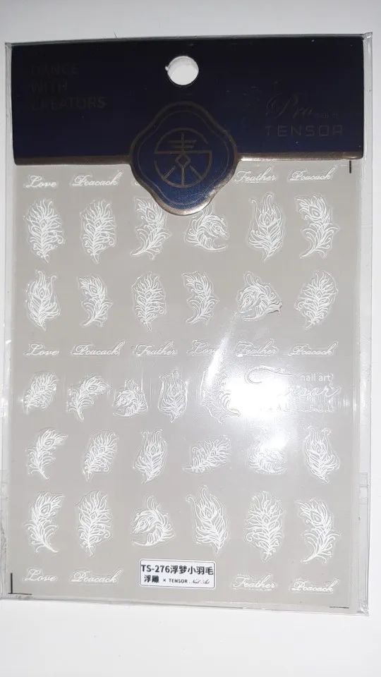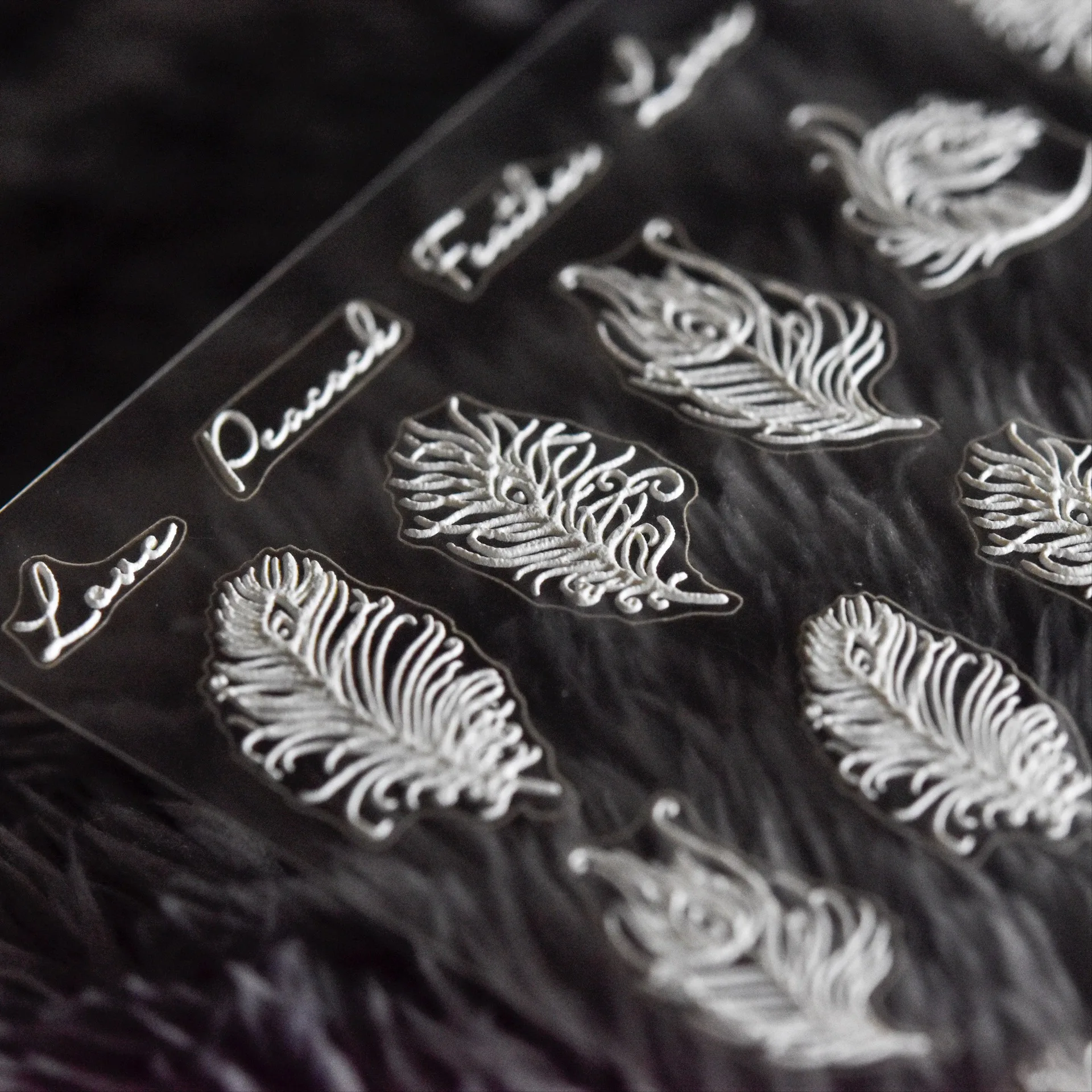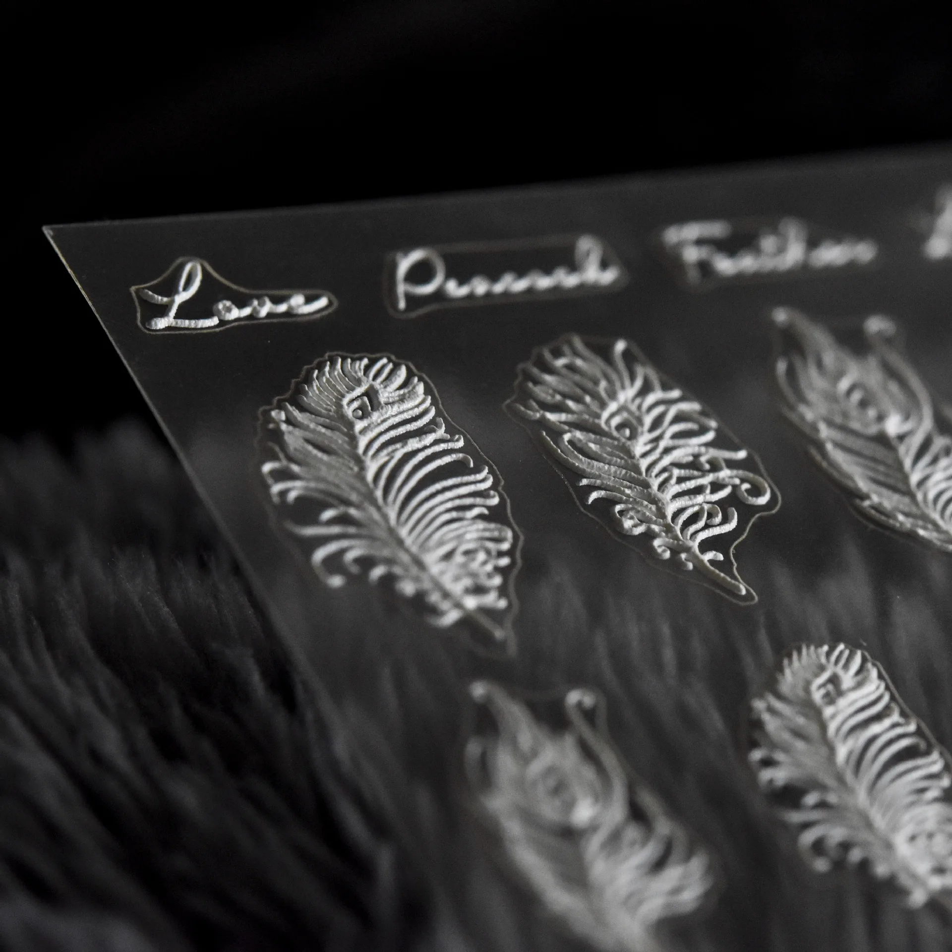 1 лист, 5D акриловые наклейки для ногтей с гравировкой, белые перья павлина, самоклеящиеся наклейки для ногтей, наклейки для маникюра