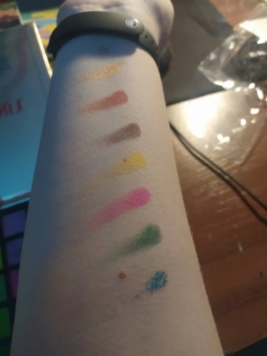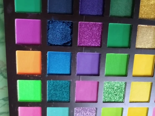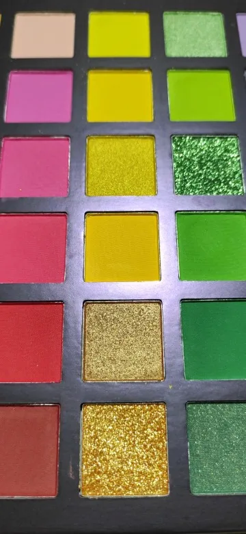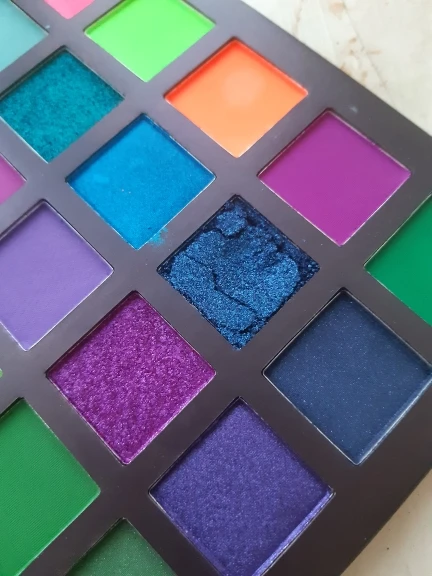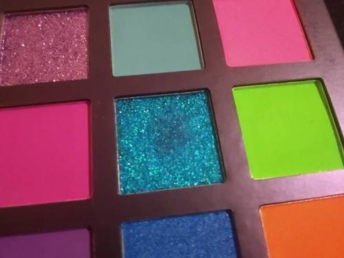Палетка дошла достаточно быстро. Трек отслеживался. Упаковка не очень надёжная, но не разбилась. Лишь маленький залом на корешке (фото 1). Второй фото, к сожалению, всю красоту не передает. Так как свотчи уже делали (смотрите ниже) я решила сделать сравнительный свотчи с палеткой от beauty glazed - color board (нижние свотчи). - фото 2. Это палетка более холодная. Здесь также лучше глиттер. А также есть обычный зелёный цвет, что мне не хватало в той палетке. Есть некоторые цвета очень необычные. Фото 3 неон и ещё некоторые. Фото 4 тени в синем освещении. В неоновом свете последние два оттенка чуть заметнее, в целом также. Тени хорошо наносятся. Некоторые немного пятнят (тёмные). В целом очень довольна.