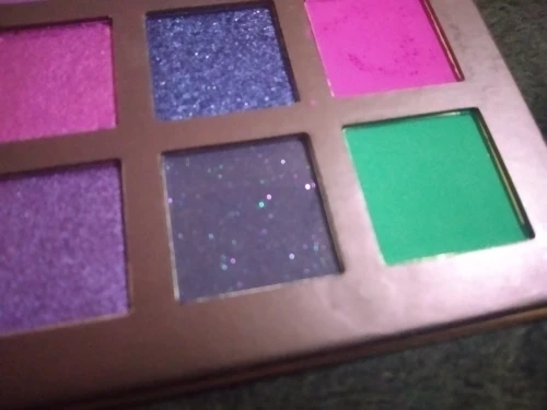 Paletka jest piękna, duża. Ładnie się budują kolory . Część z nich jest masełkowata ,Część sucha .Brokat jest na miękkiej bazie jednak nie należy ich rozcierać tylko dokładać wklepać np.palcem . Piękna polecam