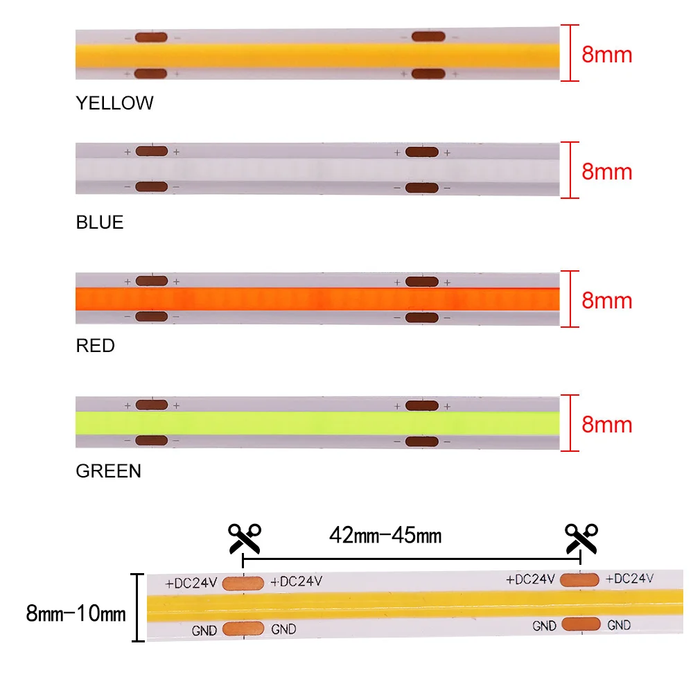Светодиодный чип: EpistarДлина: 0,5 м, 1 м, 2 м, 3 м, 4 м, 5 мВход Напряжение: DC12V /24VМощность: 8-10 Вт/мFPCB ширина: 8-10 ммКоличество СВЕТОДИОДНЫЙ: 300 светодиодный s/M,308 светодиодный s/M,384 светодиодный s/M,528 светодиодный s/MДлина резки: около 42-45 ммЦветовая температура: теплый белый (3000K), натуральный белый (4000K), холодный белый (6000K). Красный, зеленый, синий, желтыйУровень водонепроницаемости: IP20 не водонепроницаемыйИндекс цветопередачи: Ra>90Рабочая температура: -20 ℃-+ 45 ℃Температура хранения: -20 ℃-+ 60 ℃Угол обзора: 180 °Световой поток: 110 лм/ВтОсобенности: FOB новая технологияПреимущество: мягкий гибкий, можно резать, декоративное освещениеПрименение: Внутренняя/уличная декоративная подсветка, автомобильное освещение...Посылка:1 × светодиодный блок питания FCOB (блок питания не входит в комплект)