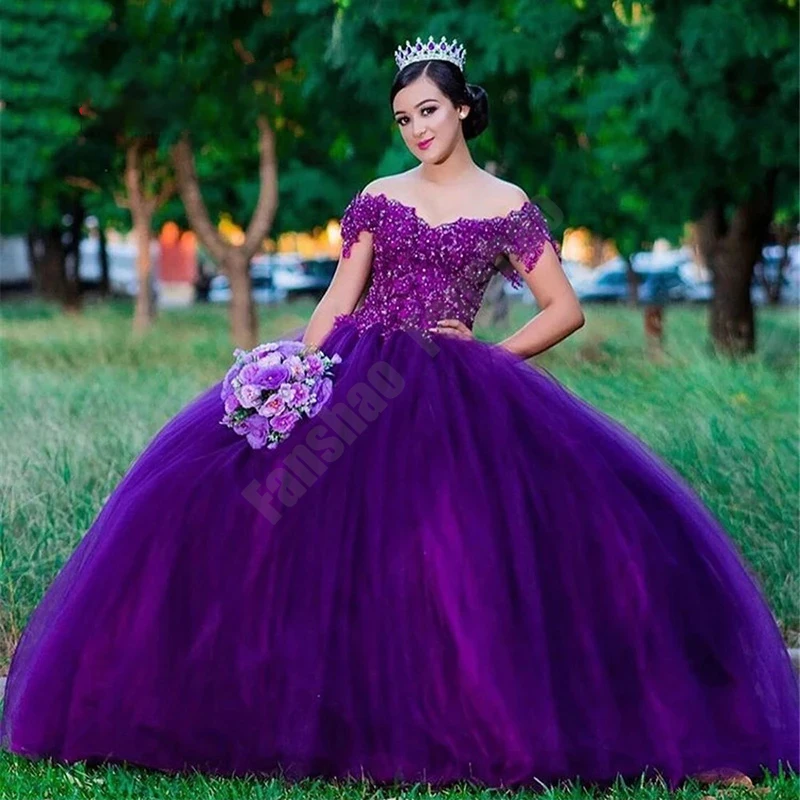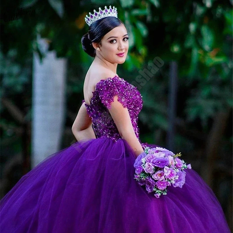 Formal Purple Prom Dress Off The Shoulder Short Sleeve V Neck Ball Vestido Gown Appliques Beads Charming Robe De Soiree