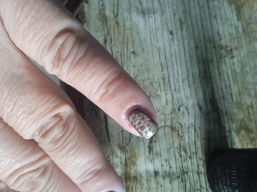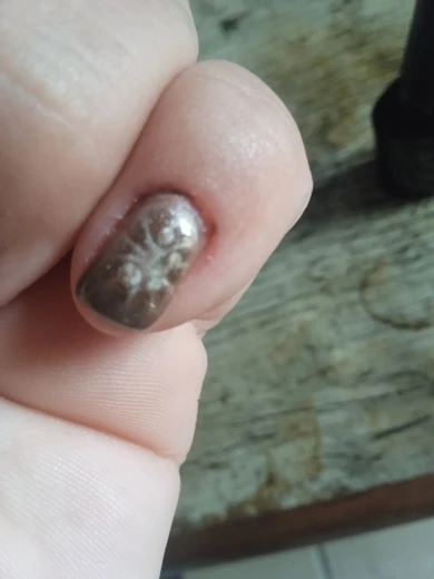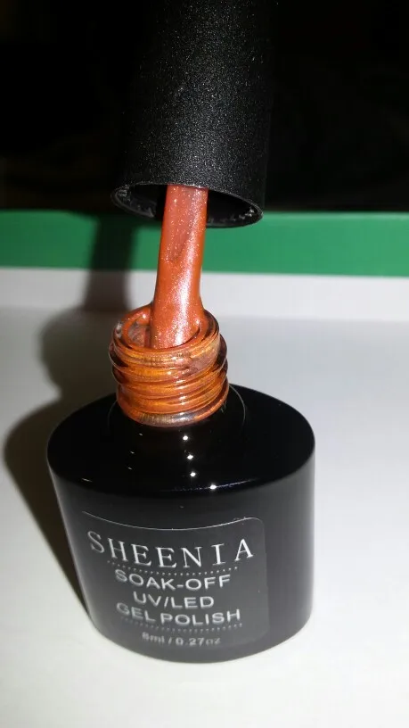 Красивый бронзовый цвет, а не темно-коричневый на фото, но даже симпатичный без магнита. Магнит работает, но влияет на сложные узоры. Бутылка 8 мл хорошо заполнена и хорошо упакована. Выглядит неплохо. Заказал половину с чипсами. Доставка за 1 чуть менее месяца.