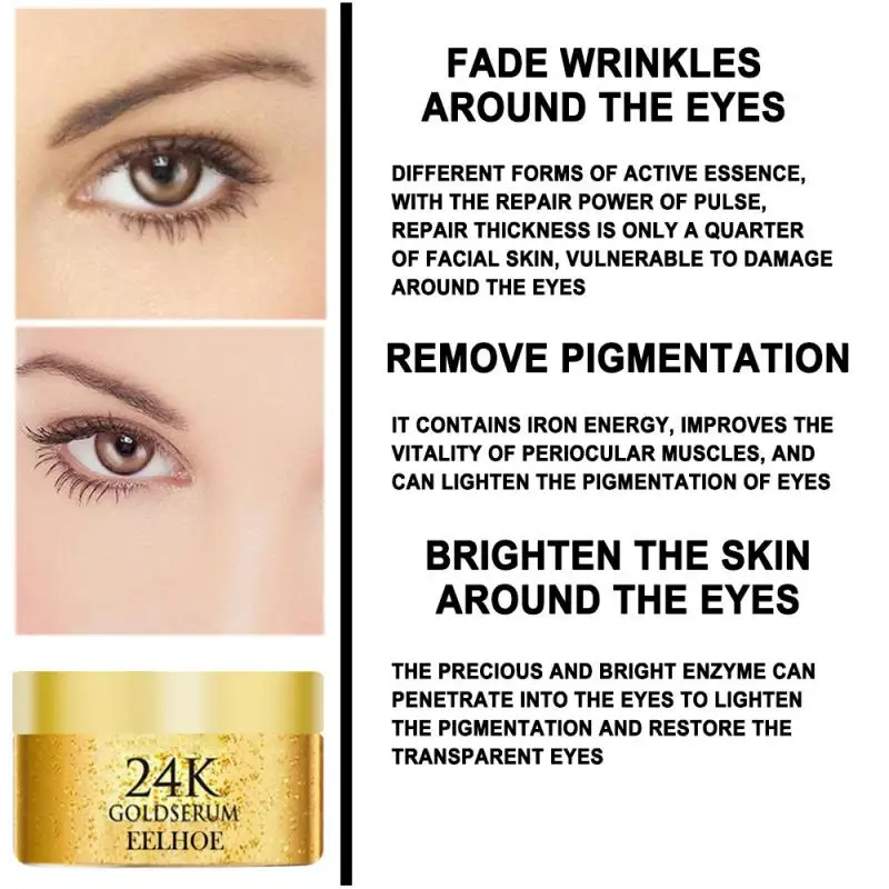 24K gold для ухода за областью вокруг глаз избавляет от морщин, уменьшает старение кожи.