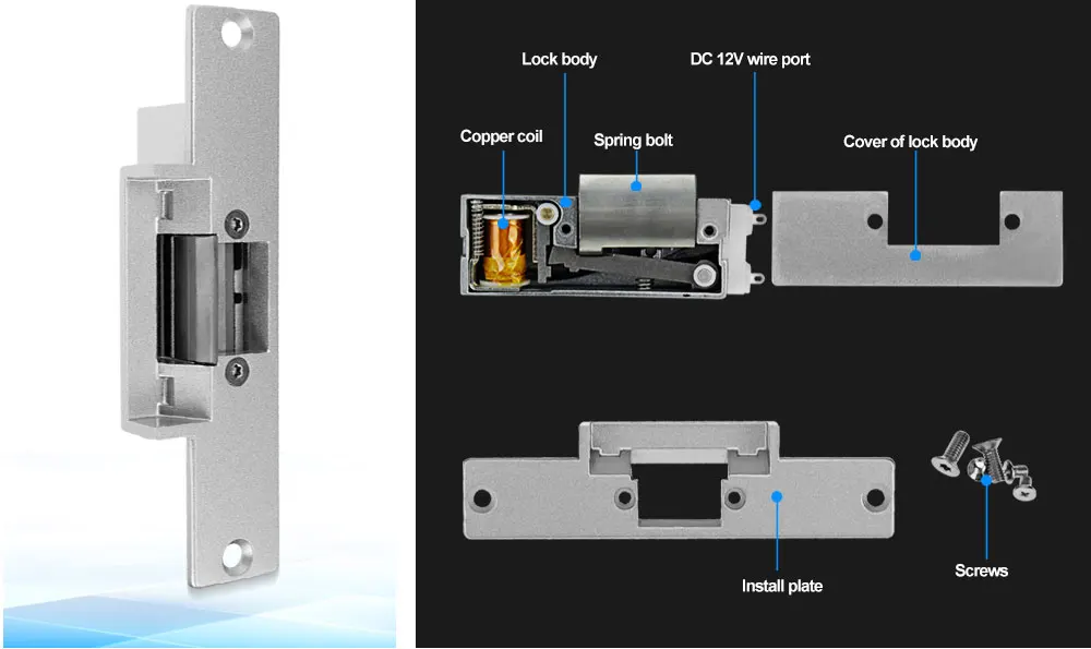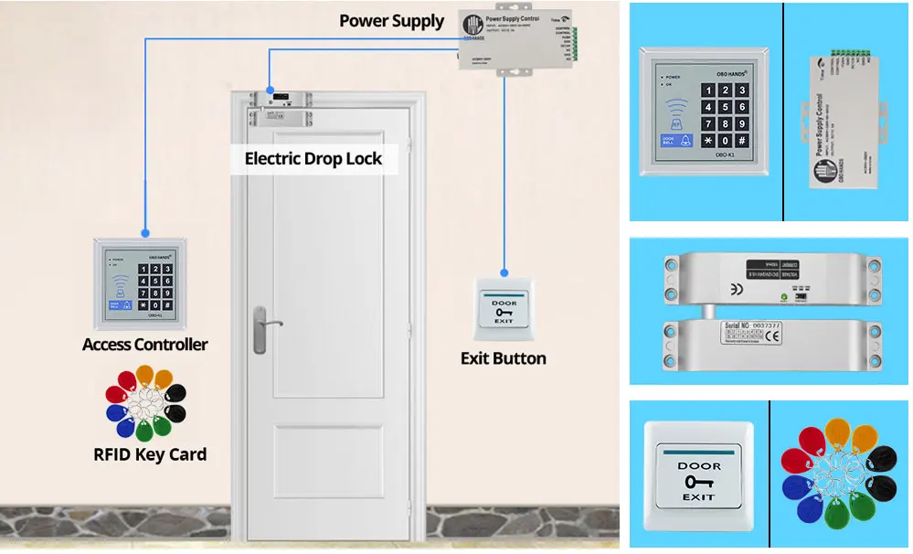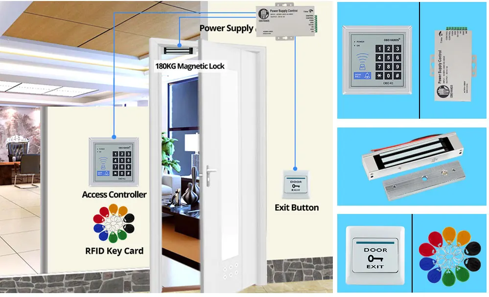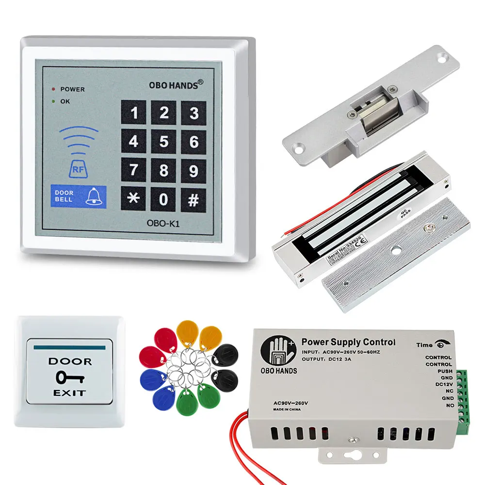 Это полная система контроля доступа, включающая клавиатуру управления доступом, источник питания 12 В постоянного тока, электрический замок, кнопку разблокировки дверей и 10 брелоков RFID. О клавиатуре управления доступом, она является поверхностью водонепроницаемой. Когда на поверхности есть капли воды, это нормально для работы.(Для того, чтобы использовать его долгое время, пожалуйста, не кладите его в воду или используйте в дождь.)О электрическом замке, есть несколько различных моделей на выбор: электрический замок удара, электрический замок падения, 180 кг разворачиваемый магнитный замок, 180 кг встроенный замок и электрический замок болта. Вы можете выбрать другую модель в соответствии с вашей дверью.