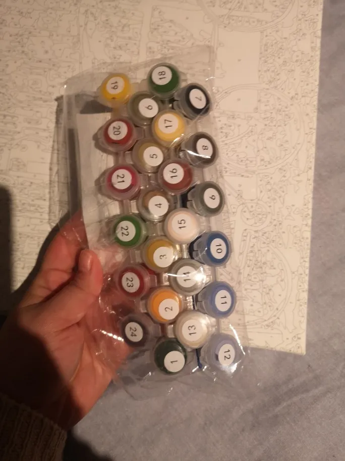 Comme sur la photo. J'espère avoir assez de peinture car j'en ai déjà fait deux, et il n'y avait pas assez de peinture pour certaines couleurs. Livraison rapide.