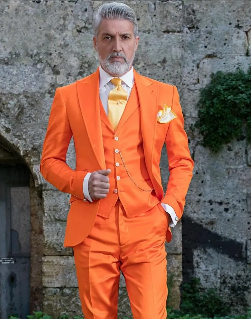 Блестящий оранжевый заостренными лацканами для мужчин, для работы, бизнеса, костюм 3 предмета в комплекте Красивый смокинг для жениха Вечерние платье для выпускного вечера (куртка + брюки + жилет + галстук-бабочка) NO:288