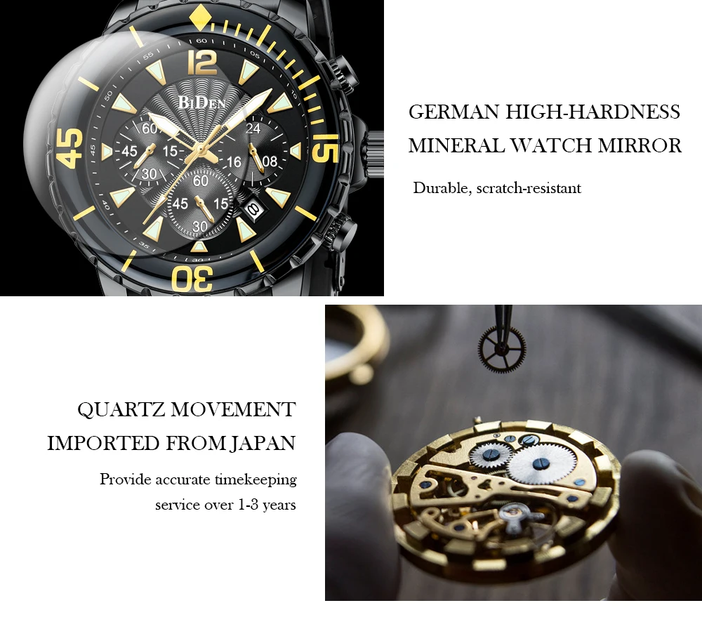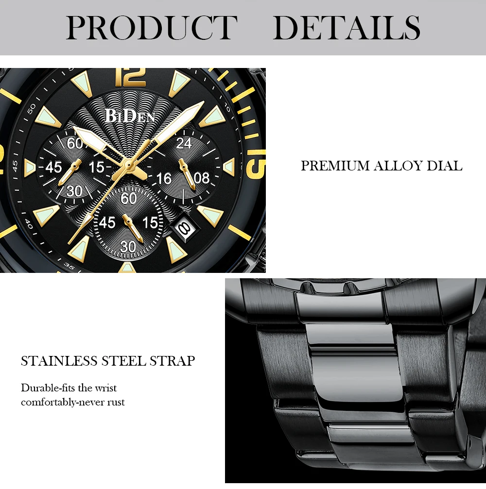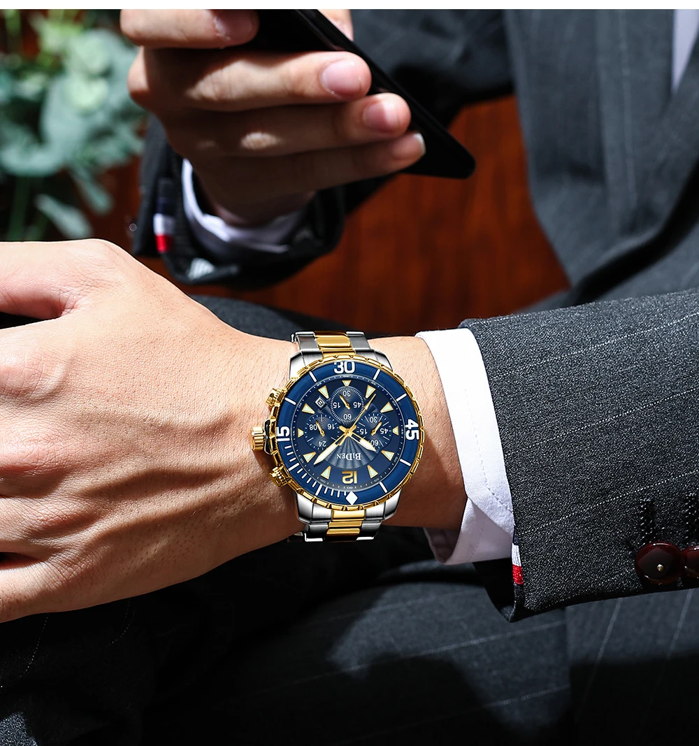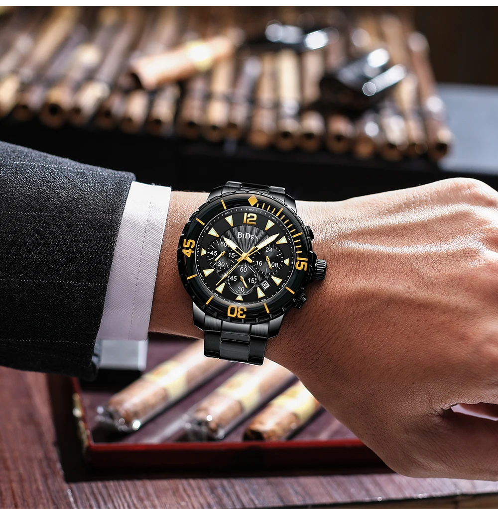 Компания BIDEN Brand, все заказы отправляются в течение 2 дней. Материал корпуса: сплав Материал ремешка: стальной ремешок Материал зеркала: минеральное стекло Материал нижней крышки: сталь 304 Диаметр корпуса: 46 мм Толщина корпуса: 13 мм Ядро: механизм PE902 Защита от воды: 30 м Вес: 164 г Посылка 1 часы BIDEN. 1 х Оригинальный Бархатный Чехол для часов BIDEN. 1 x Руководство пользователя с гарантийным талоном. 1 x тканевая салфетка для чистки часов. Особенности: Водонепроницаемость 3 АТМ (ежедневная Ручная стирка и дождь в порядке, дайвинг и плавание не поддерживаются.) С хронографом (секундомером), светящимся и отображающим дату; Идеально подходит для любого вида делового, повседневного, спортивного, внутреннего или повседневного использования.