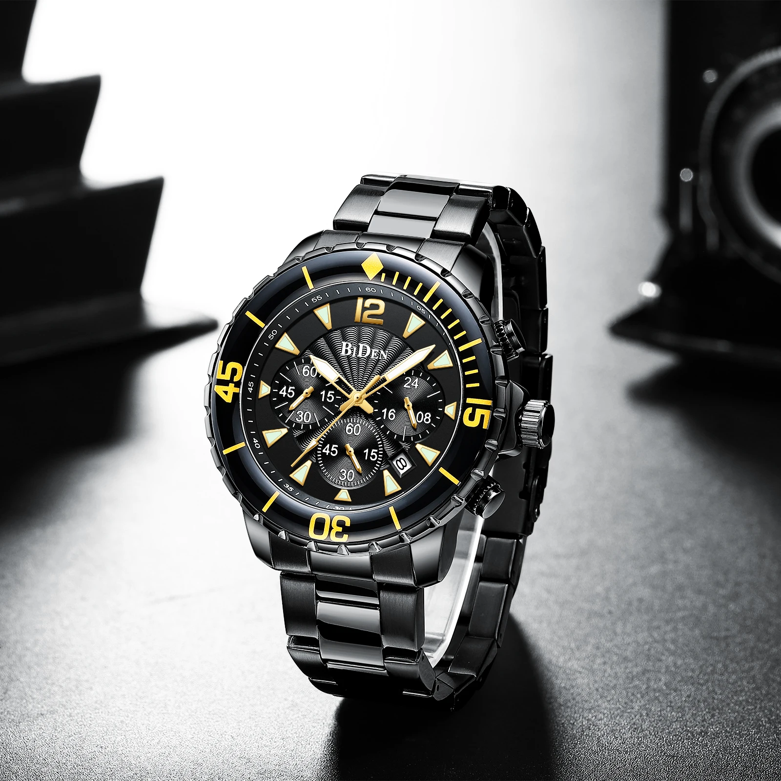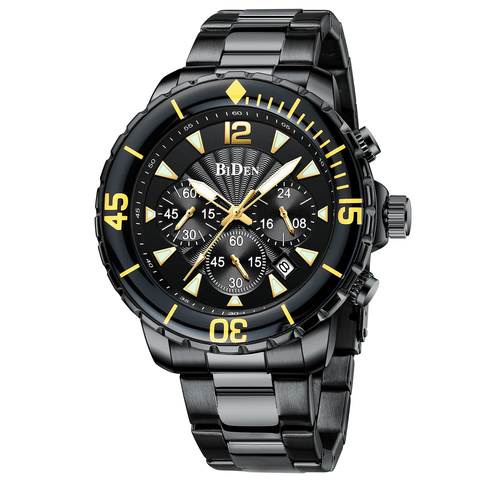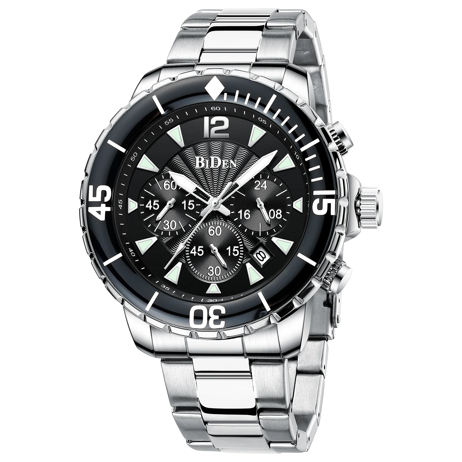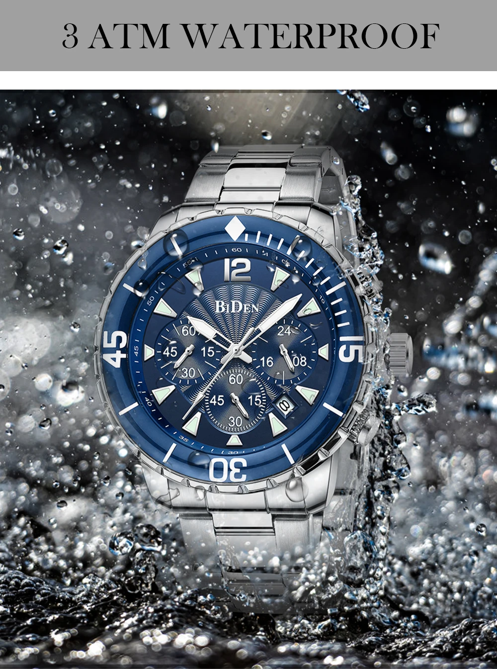Компания BIDEN Brand, все заказы отправляются в течение 2 дней. Материал корпуса: сплав Материал ремешка: стальной ремешок Материал зеркала: минеральное стекло Материал нижней крышки: сталь 304 Диаметр корпуса: 46 мм Толщина корпуса: 13 мм Ядро: механизм PE902 Защита от воды: 30 м Вес: 164 г Посылка 1 часы BIDEN. 1 х Оригинальный Бархатный Чехол для часов BIDEN. 1 x Руководство пользователя с гарантийным талоном. 1 x тканевая салфетка для чистки часов. Особенности: Водонепроницаемость 3 АТМ (ежедневная Ручная стирка и дождь в порядке, дайвинг и плавание не поддерживаются.) С хронографом (секундомером), светящимся и отображающим дату; Идеально подходит для любого вида делового, повседневного, спортивного, внутреннего или повседневного использования.