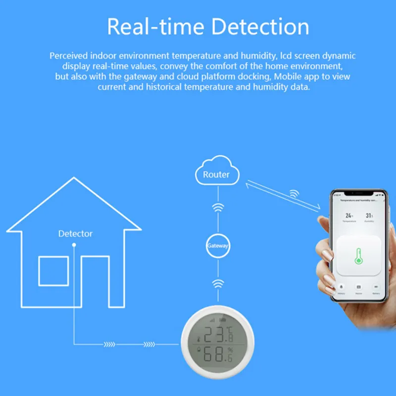 Воспринимаемая температура и влажность в помещении, динамический экран Icd отображает значения в реальном времени, передает комфорт в домашней среде, а также с док-станцией для облачной платформы, мобильное приложение для просмотра текущих и исторических данных о температуре и влажности.