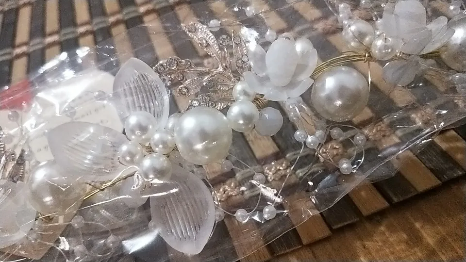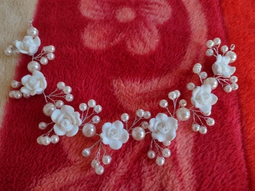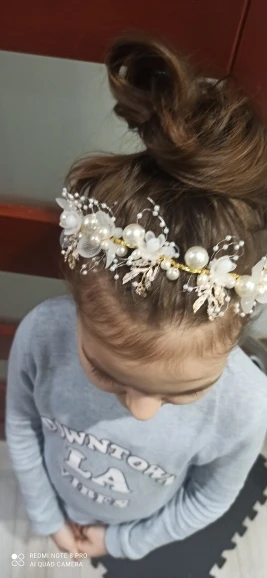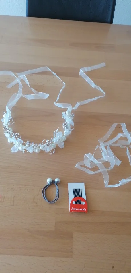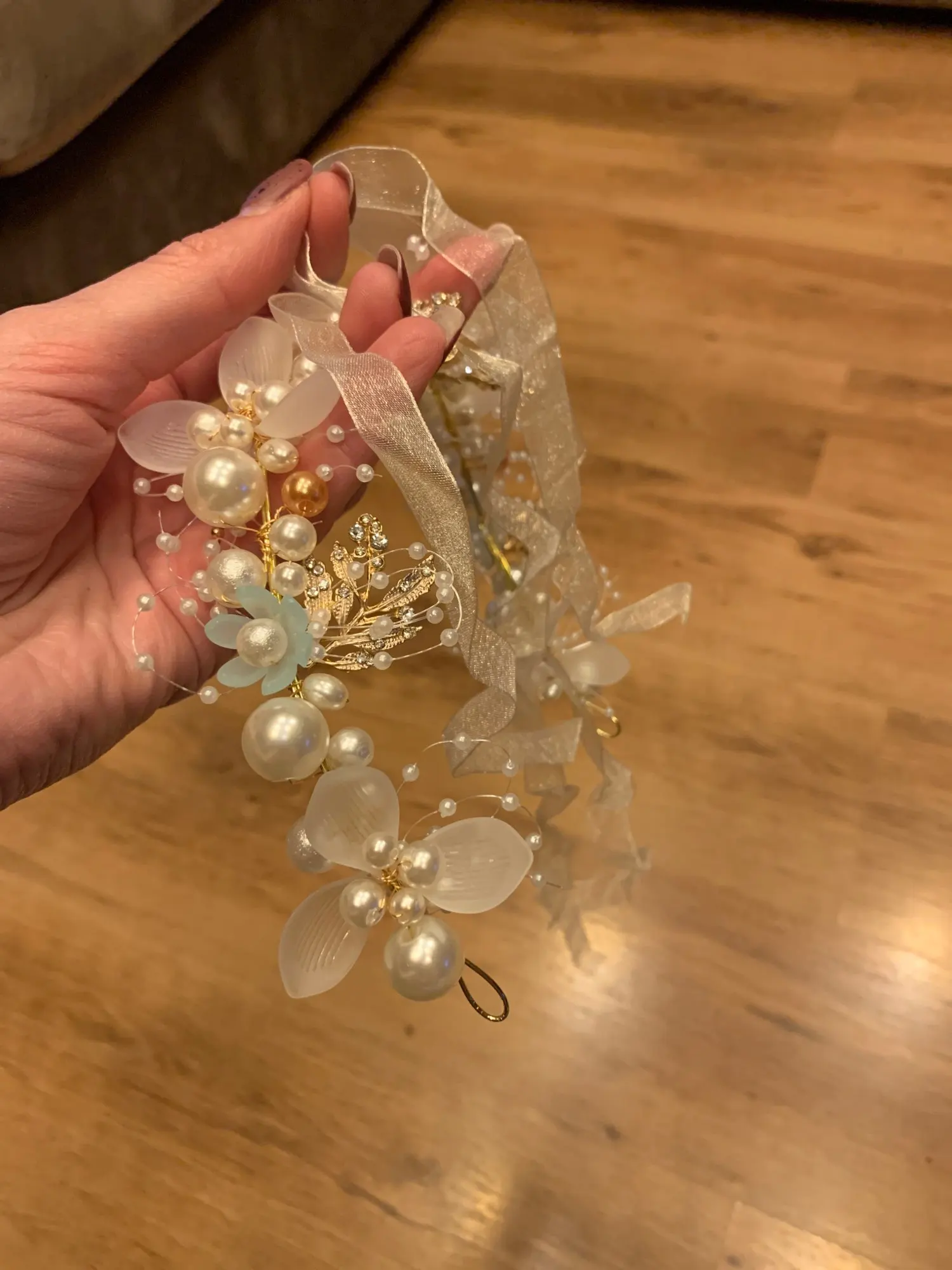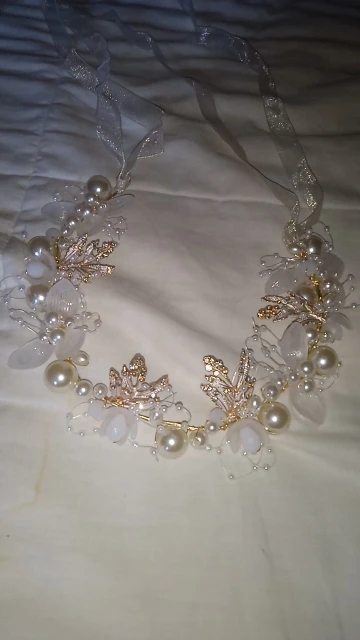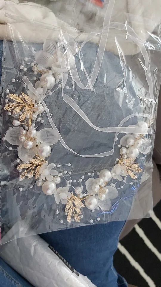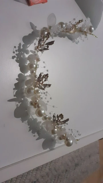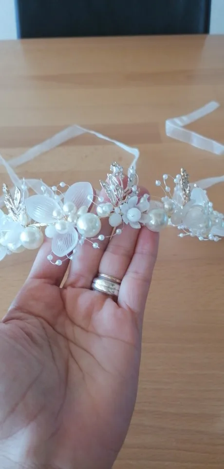Изображение с синей лентой низкого качества, поэтому внешний вид zaklamuje на самом деле. Изображение выглядит как Серебряная гирлянда с белыми и синими добавками, и на самом деле золото с кремовой лентой. И больше это повязка на голову, чем гирлянда. Но качество изготовления очень хорошее.