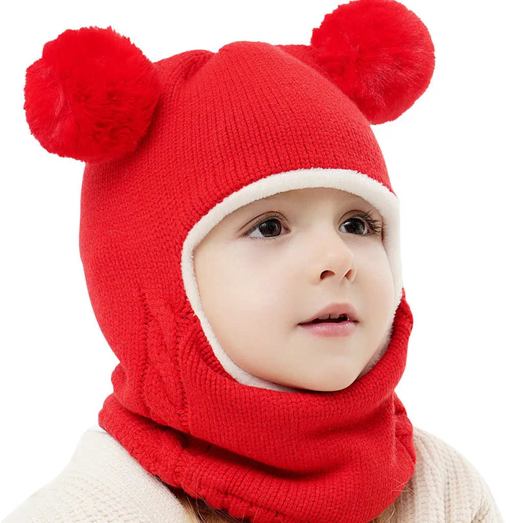 Детская шапка 2-7 лет, зимние теплые однотонные вязаные шапки с капюшоном и плюшевыми шариками с мультяшным принтом для маленьких мальчиков и девочек, шарф на шею, 2020