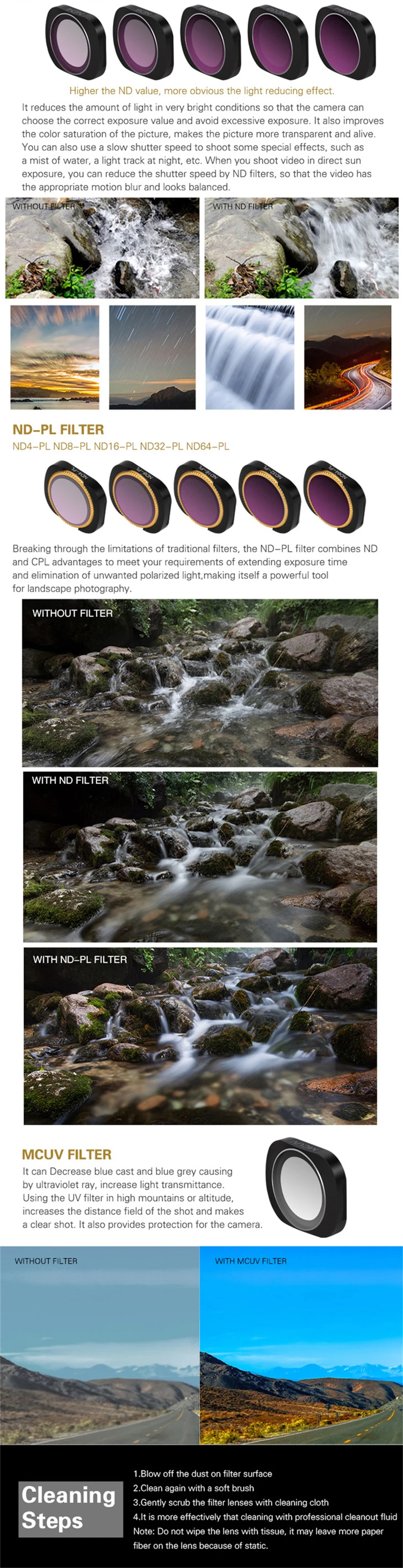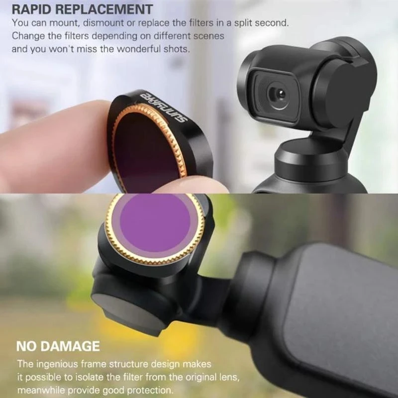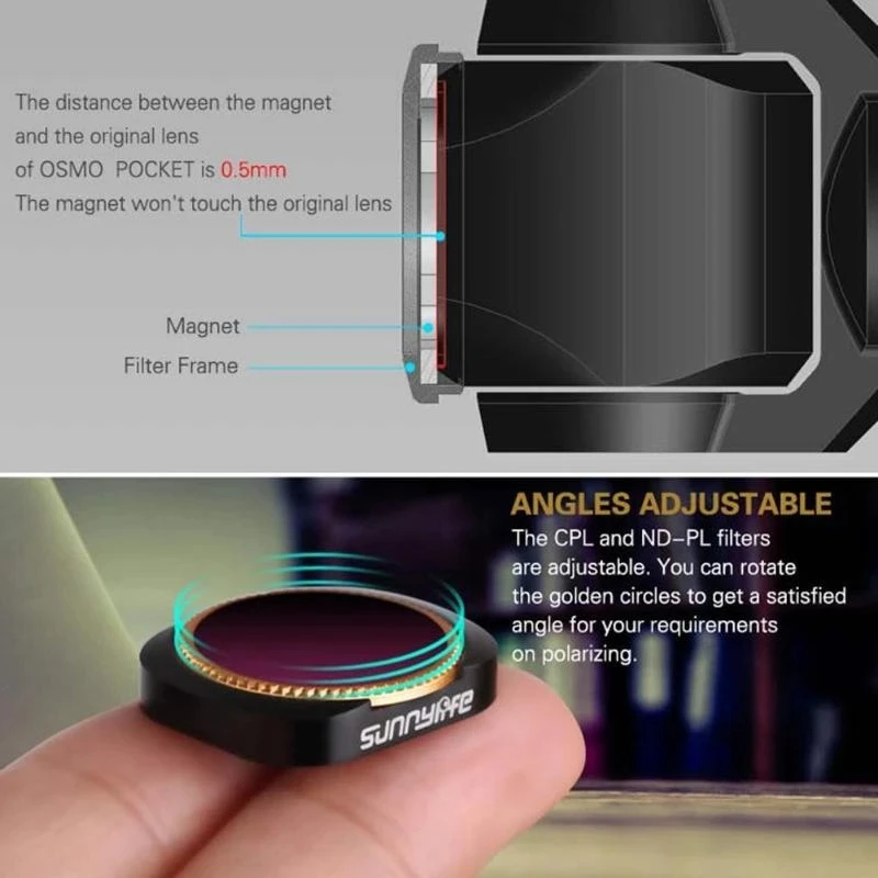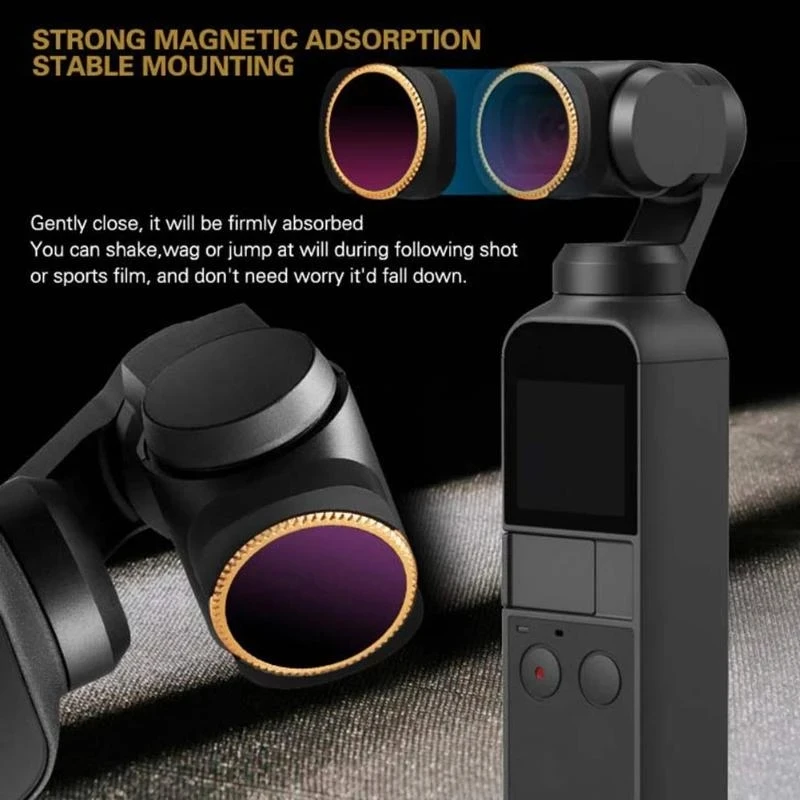 Набор смешанных фильтров 3 в 1: CPL, ND8, ND16 Набор фильтров 3в1 ND-PL: ND4-PL, ND8-PL, ND16-PL Набор фильтров 4в1 ND: ND4, ND8, ND16, ND32 4 в 1 ND-PL набор фильтров: ND8-PL, ND16-PL, ND32-PL, ND64-PL 4 в 1 ND-X набор фильтров: ND32, ND64, ND32-PL, ND64-PL Набор фильтров 6 в 1: MCUV, CPL, ND4, ND8, ND16, ND32 OP-FI370:ND4 + ND8 + ND16 + ND4-PL + ND8-PL + ND16-PL Особенности: Регулируемые фильтры CPL и ND-PL, вы можете повернуть золотой круг, чтобы получить удовлетворенный угол для ваших требований о поляризации Магнитный съемник для жестких бирок для электронного отслеживания товара, адсорбции для стабильно на голову, для этого способа работы расстояние между магнитом и оригинального объектива OSMO кармана равен 0,5 мм, не сенсорный экран Обычно используется, вы можете встряхнуть, вопить или прыгать по желанию во время следующего кадра или спортивный фильм, не нужно беспокоиться, что он упадет Быстро меняйте фильтры в зависимости от различных сцен, и вы не пропустите прекрасные снимки Специально подобранные Профессиональные оптические стеклянные линзы (импортированные из Германии), чтобы сделать ваши фотографии более профессиональными