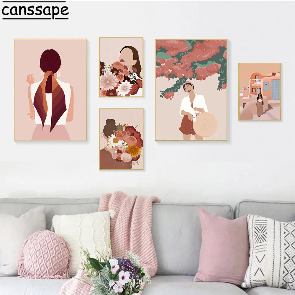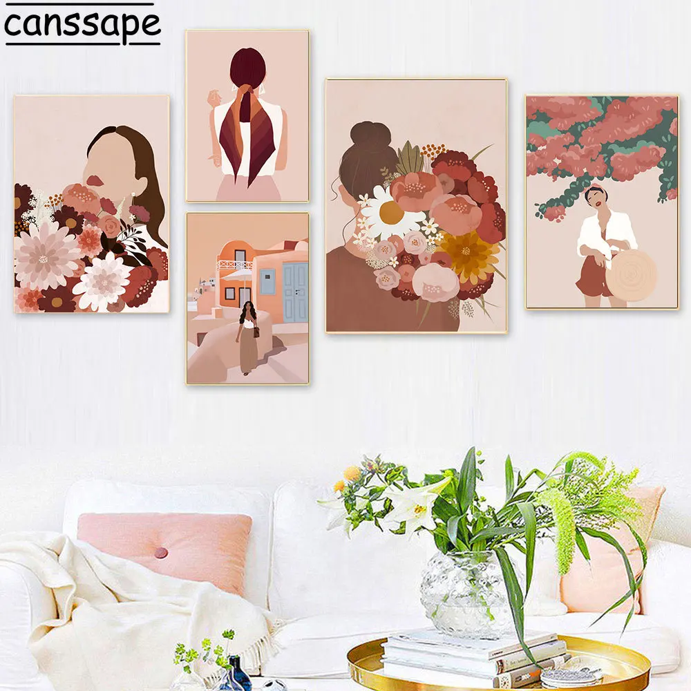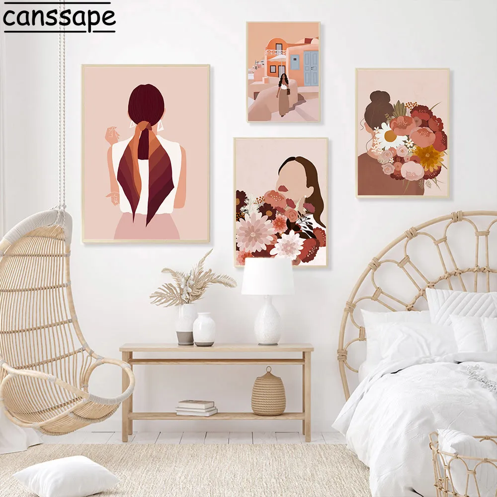 Постер в скандинавском стиле с изображением цветов и женщины, абстрактная фигурка, холст в стиле бохо, художественные принты, галерея для девочек, постер, современные настенные картины, домашний декор