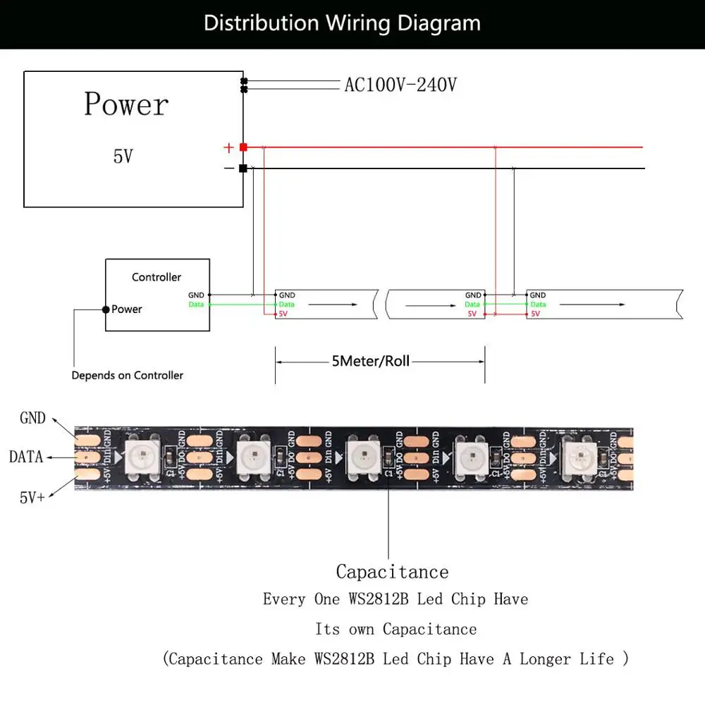 1. Светодиодная лента WS2812B питается от "5 В питания" (не входит в комплект) и управляется одной линией передачи данных от подходящего контроллера (не входит в комплект).