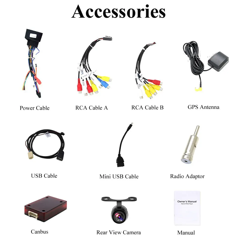 1. Кабель питания (подключи и работай) * 12. Кабель RCA A & B * 13.GPS антенна * 14. Задний USB кабель * 15. Передний USB кабель * 16. Внешний микрофонный кабель * 17. Радио адаптер * 18.Canbus * 19. Руководство * 110. Встроенная карта * 1 (можно нажать кнопку "GPS" или "Navi")11. Камера заднего вида * 1