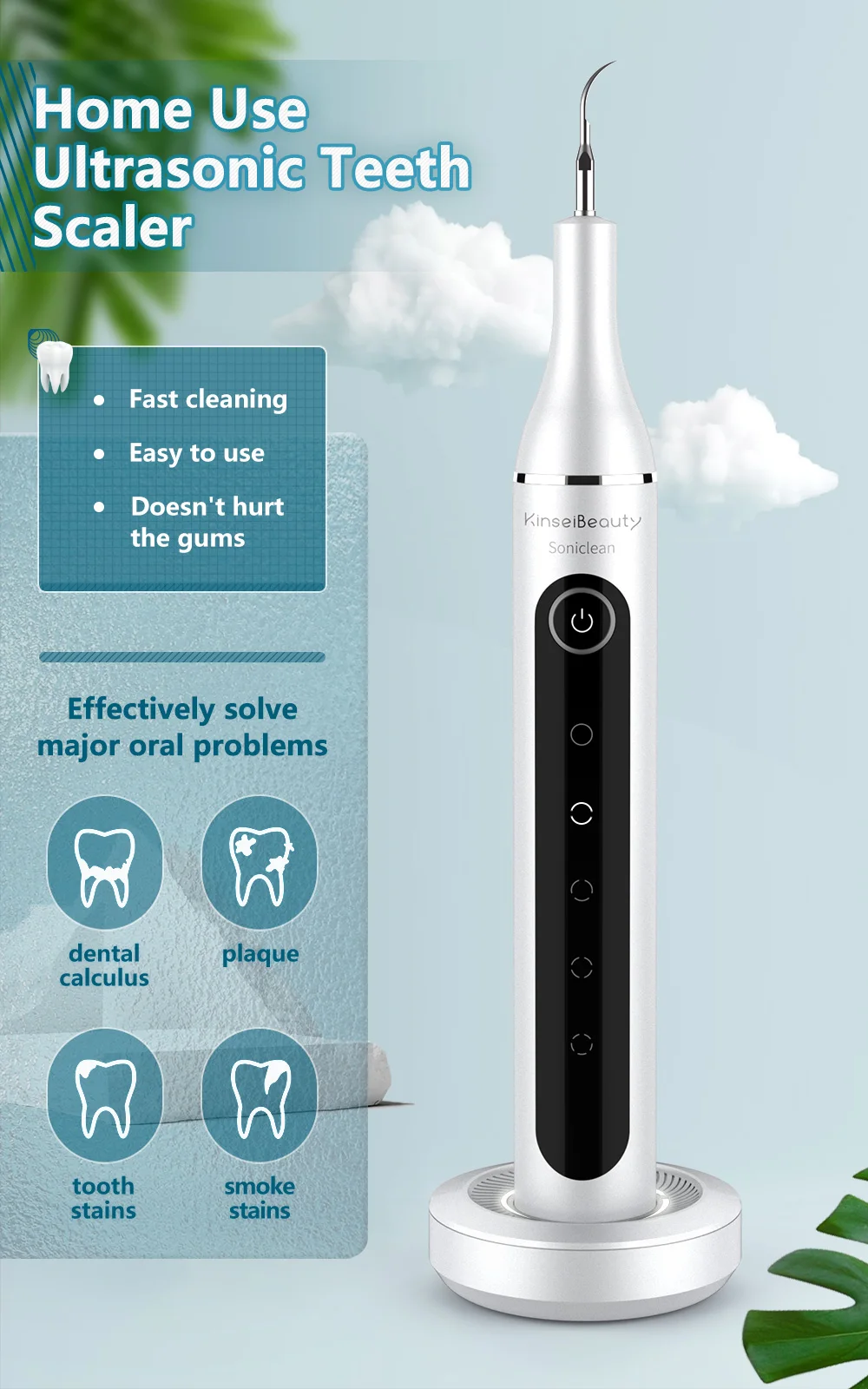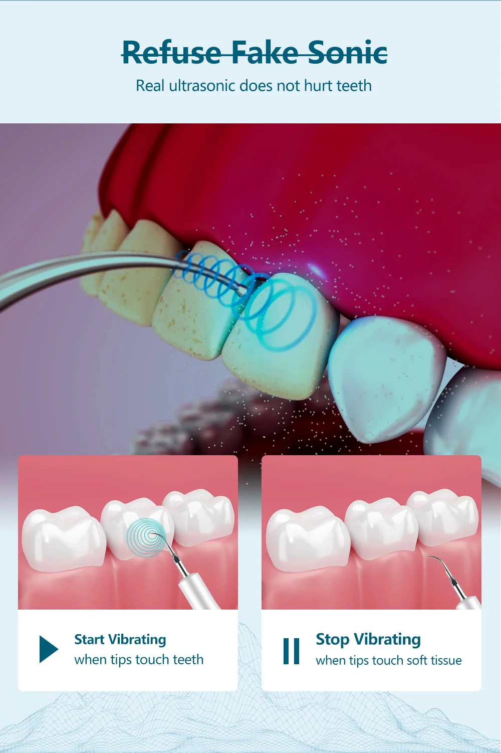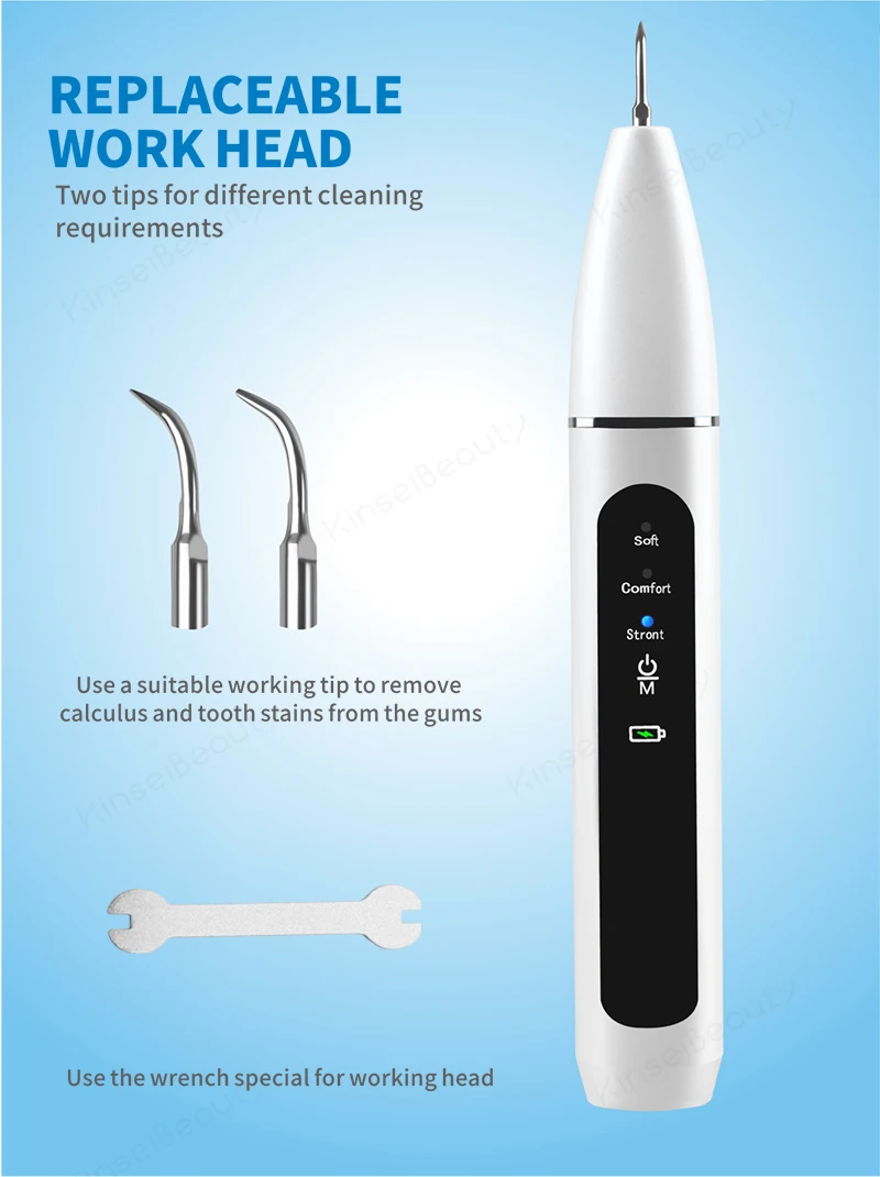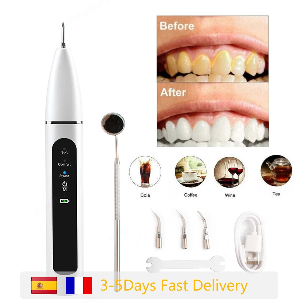 Да, работает. Вибро шпатель, имеет три шпателя, два острых и один широкий, в комплекте зеркало. Встроеный аккумулятор батарея, заряжается по старинке microUSB. Три режима, двойное нажатие, фонарик. Потребление до 1 ампера. Писк слышен когда прислоняется к зубному налету. Шпателем треш о камень или налет, происходит снятие, зубная кость не страдает, болевых ощущений нет. Требуется докупать полировалку, после полировать зубы. Рекомендую.