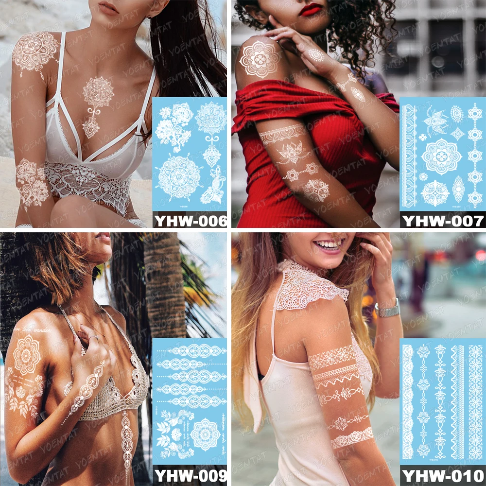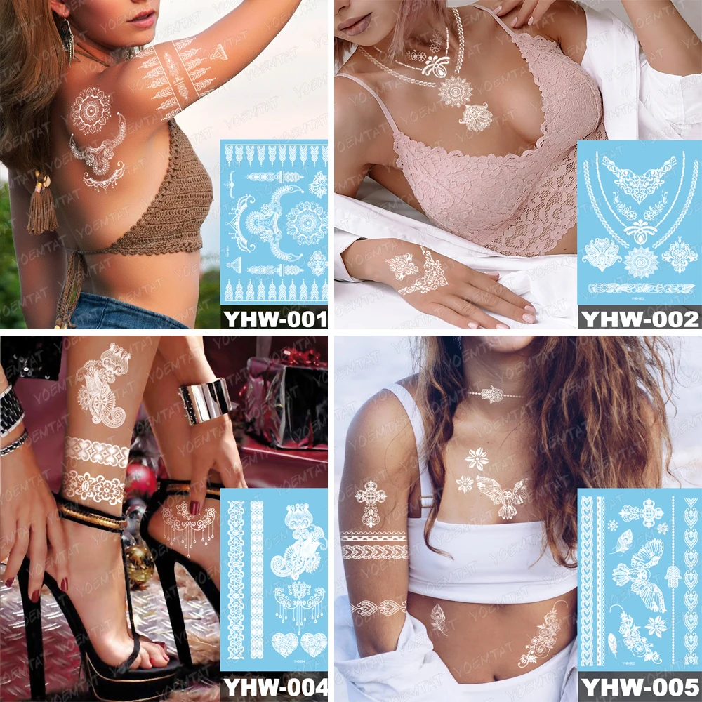 Индийский Арабский Дизайн Временная водостойкая татуировка стикер белое кружевное платье невесты татуировки золотого и серебряного паста поддельные татуировки Мандала для боди-арта ручной колье-чокер