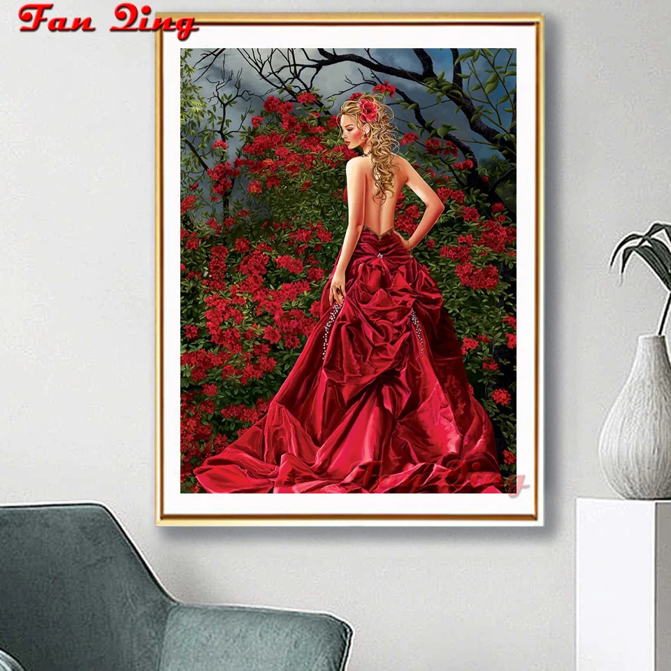 5D алмазная живопись «сделай сам», розово-красное платье, девочка, полный квадрат, круглая стразы, вышивка крестиком, украшение для дома, подарок