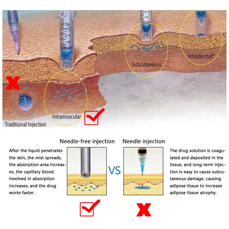 Под давлением, пружина и поршень может быстро и равномерно инъекционные наркотики под кожу через отверстие диаметром 0,1 мм, диаметр которых составляет два раза меньше Так как толщина иглы для инъекций! С помощью механической энергии пружины и специальные поршни в устройстве позволяют быстро, но медленно протолкать лекарство через КрошечныеОтверстия подкожной клетчатки под давлением.По сравнению с введением игл, поглощение и поглощение лекарственных средств намного лучше и быстрее. Это было подтверждено в серии исследований и тестов, проводящихся в разных странах по всему миру. Идеальное решение для людей, склонных к рубцам и сгусткам крови под кожей.