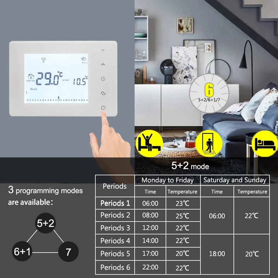 Установочные провода следует выбрать с твердым проводом 1,5-2,5 мм2. Пожалуйста, правильно Подключите провода строго в соответствии с схемой подключения. Не попадайте в термостат воду, грязь и другой мусор, иначе это повредит термостат.