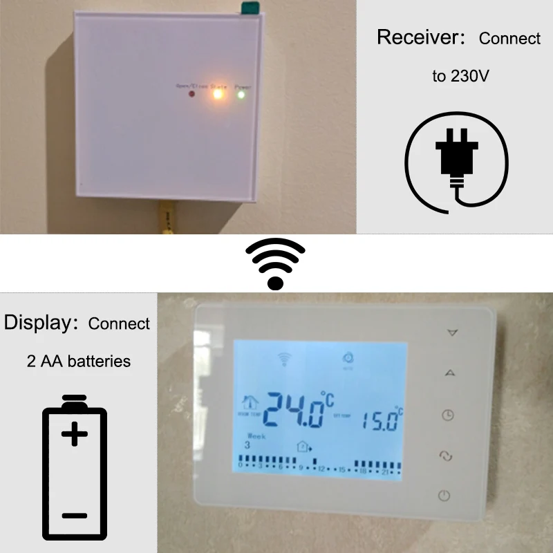 Панель термостата является излучателем. Он имеет две секции батареек AA 1,5 В. Панель термостата можно поставить в любую комнату. Приемник обычно устанавливается помимо котла и подключается к котлу.