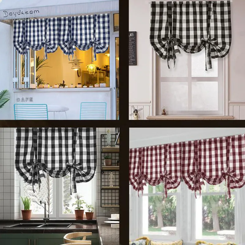 Клетчатая печать, короткая оконная занавеска с отверстием, регулируемые римские жалюзи, Затемненные занавески для гостиной, кухни