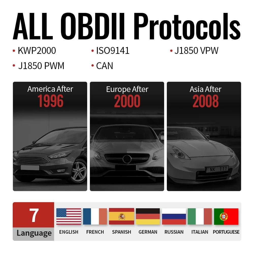 MUCAR CDL20 совместим с большинством американских, европейских и азиатских моделей, изготовленных с 1996 года. Поддерживает все протоколы OBDII: KWP2000, ISO9141, J1850 VPW, J1850 PWM и CAN (сеть контроллера). Если вы не знаете протоколы OBD2 вашего автомобиля, вы можете проверить разъем OBD2 вашего автомобиля ли 16 Pin. Если да. Этот товар поддерживает ваш автомобиль. Пожалуйста, обратите внимание. Этот товар только проверяет ваш автомобильный двигатель.1. Список американских автомобилей:Нужен стандарт obd2 и год выпуска с 1996 года-сейчасChrysler, Ford, GM, Jeep, Lincoln, Buick, Cadillac, Chevrolet, Dodge, HM, ect...2. Европейский список автомобилей:Нужен стандарт obd2 и год выпуска от 2000-nowMercedes Benz, Smart, Sprinter, BMW, Volkswagen, Skoda, Audi, Opel, Lamborghini, Porsche, Maybach, Ford, Land Rover, Jaguar, Aston Martin, Bentley, Rolls-Royce, rover, Mini, Vauxhall, DR, Ferrari, Fiat, Abarth, Lancia, Alfa Romeo, Maserati, Bugatti, Peugeot, Citroen, Renault, Saab, Volvo, GM, GMSA, Dacia ,Seat, и т. Д...4. Японский/Корейский список автомобилей:Нужен стандарт obd2 и год выпуска с 2008 года-сейчасHonda, Acura, Toyota, Scion, Lexus, Mazda, Nissan, Infiniti, Isuzu, Daihatsu, Suzuki, Mitsubishi, Subaru, Samsung, Daewoo, Hyundai , Kia, и т. Д...5. Список китайских автомобилей:Нужен стандарт obd2, и год выпуска с 2014 года-сейчасGreat Wall, Huachen, Geely, DF Honda ,Lifan и т. Д.Предупреждение ющее уведомление1. Несмотря на то, что он совместим с большинством автомобилей, но различные регионы поддерживают протокол OBD2 транспортного средства в разное время, или некоторые машины имеют специальный дизайн, поэтому он может не совместим с некоторыми автомобилями, которые не поддерживают протокол OBD2. Особенно японский и корейский автомобильный бренд.2. Не поддерживает Российские Автомобили до 2012 года, ВАЗ, УАЗ, Лада; Не работает с 24V грузовикамиДля Renault, SsangYong, пожалуйста, свяжитесь с нами перед покупкой.