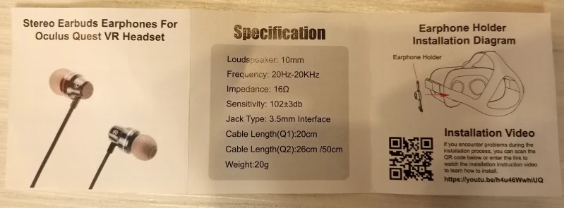 Отличные наушники. Удобная установка на Oculus Quest 2 (есть ссылка на видео инструкцию в инструкции к наушникам). Звук хороший, намного громче стандартных динамиков VR гарнитуры. Доставка в Волгоград за 12 дней. На гарнитуре выглядит всё отлично, как часть VR гарнитуры.
