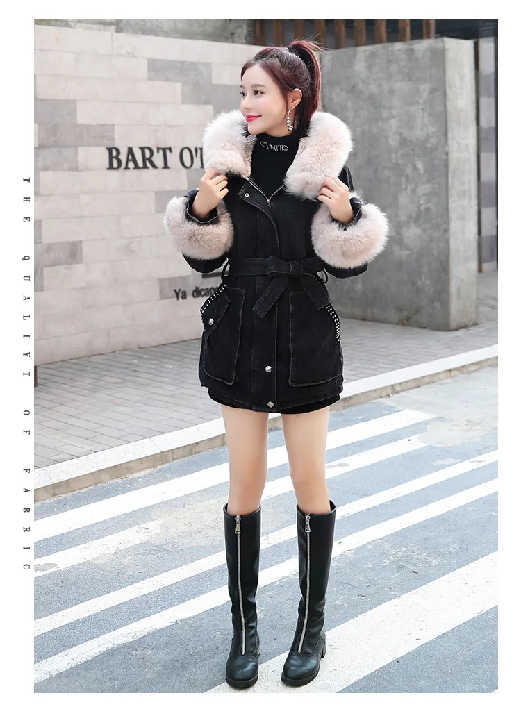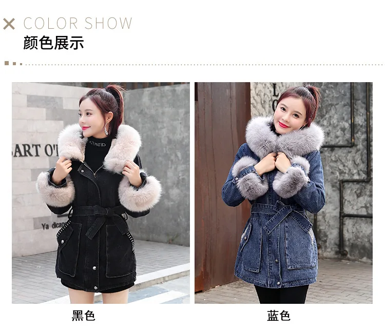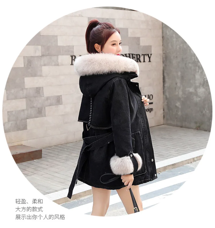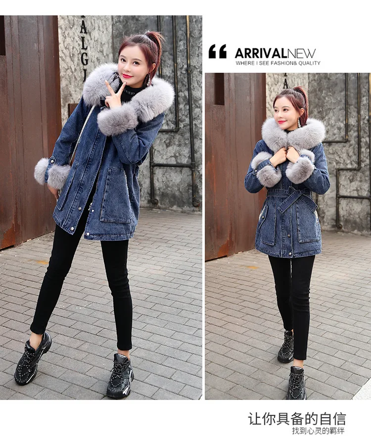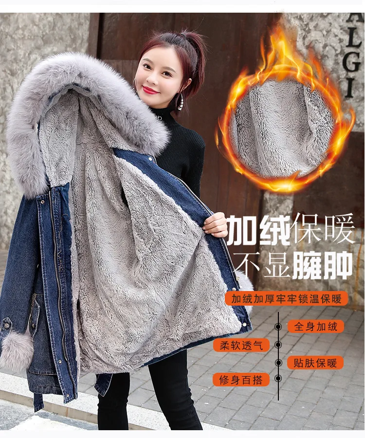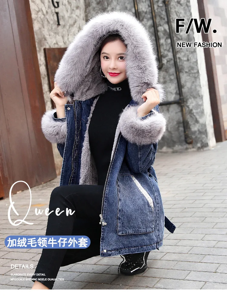 Женская утолщенная джинсовая куртка FNOCE, с бархатным утеплителем, с капюшоном и меховым воротником, модная уличная одежда из денима X-Long, зима 2020