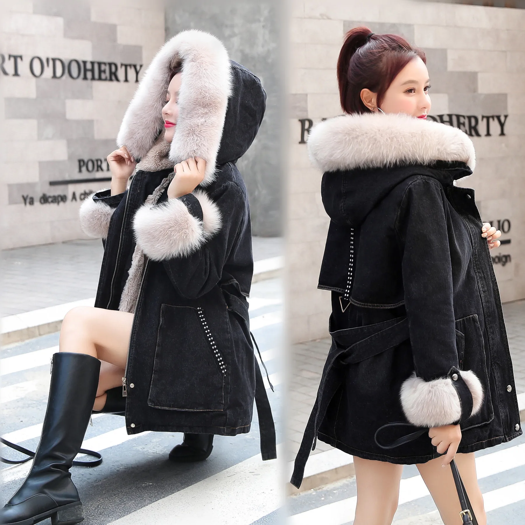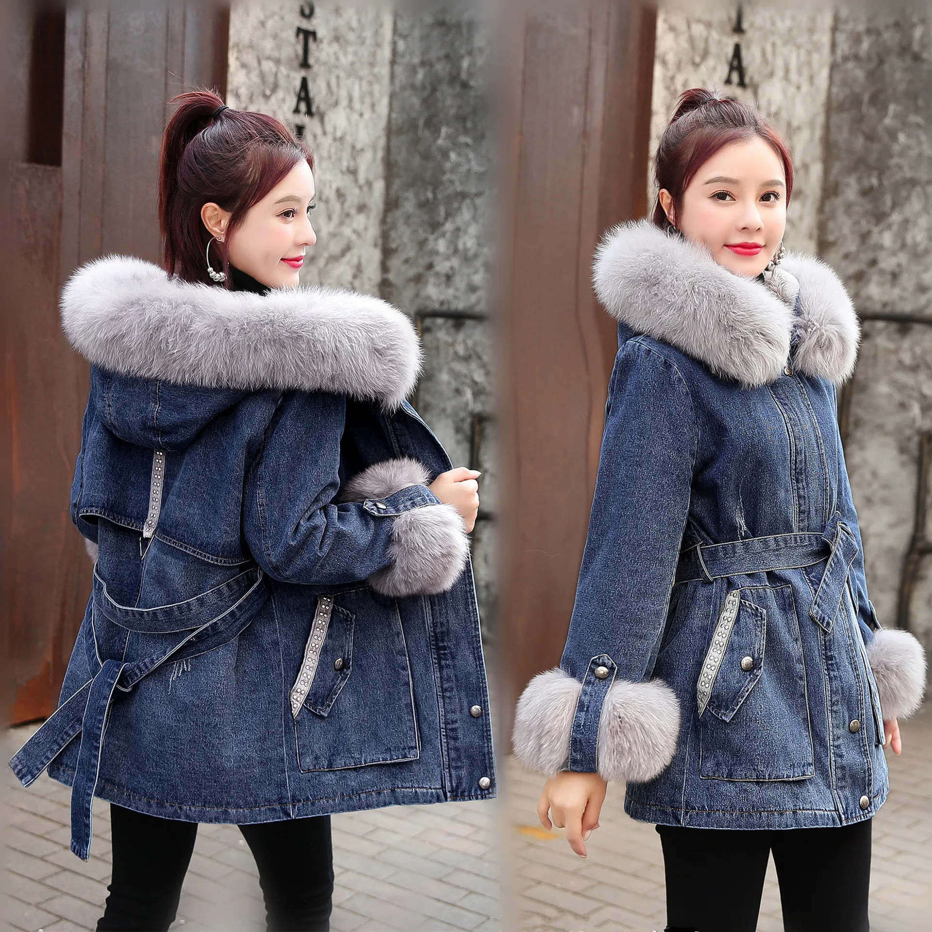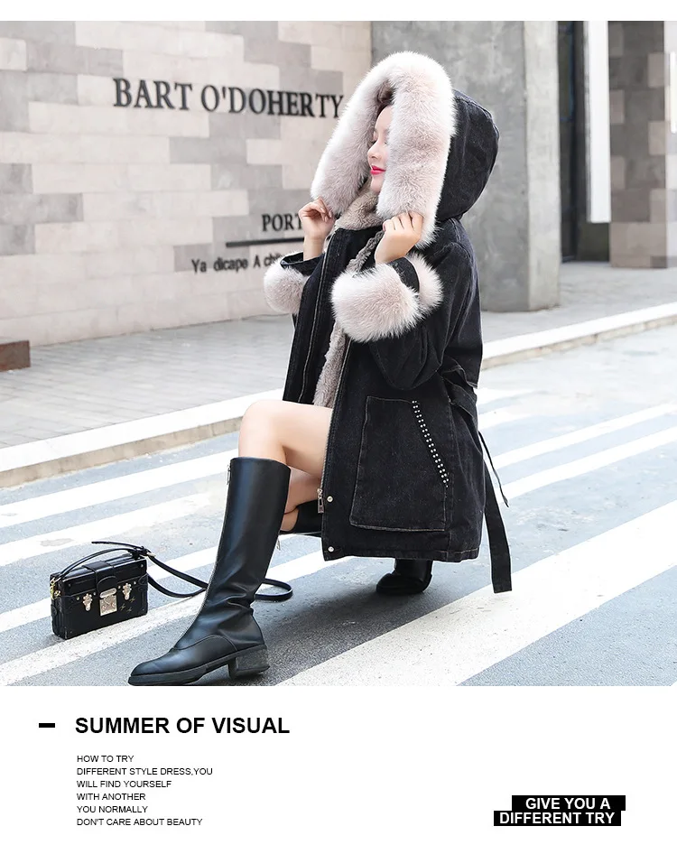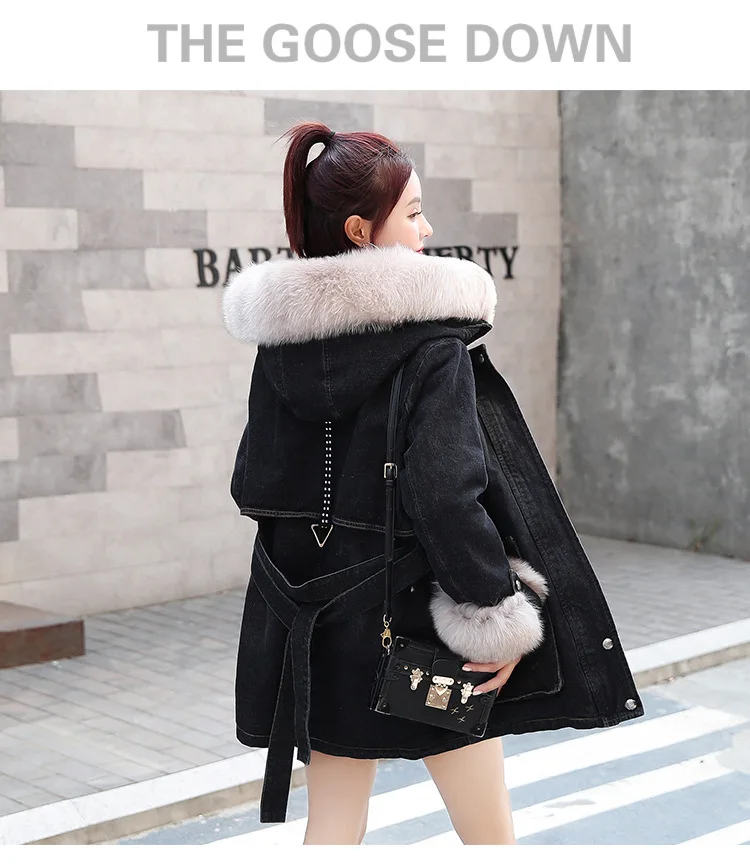 Женская утолщенная джинсовая куртка FNOCE, с бархатным утеплителем, с капюшоном и меховым воротником, модная уличная одежда из денима X-Long, зима 2020