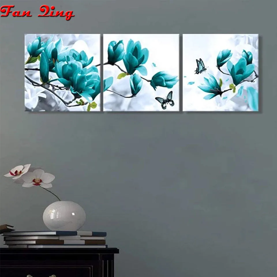 Триптих 5D Diy Алмазная картина с магнолией бабочка камни в форме ромба круглые стразы вышивка крестиком украшение дома