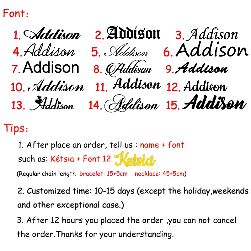 1. После размещения заказа сообщите нам: Имя + шрифт