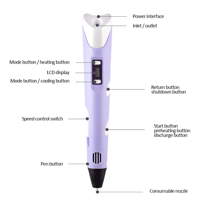 Экологически чистый материал: Изготовлен из ABS и PLA расходных материалов, эта печать является здоровой и экологически чистой.Удобный и быстрый: с ЖК-дисплеем вы можете смотреть на температуру и регулировать температуру в любое время и в любом месте, удобно и быстро.Хороший инструмент: это хороший инструмент для развития у своих детей неограниченного воображения.Применение: это изделие используется для детской печати и ручной работы.Идеальный подарок: Эта ручка для рисования может быть предоставлена детям в качестве подарка, и помочь им leran счастливо. Спецификация:Название продукта: 3D Ручка для печатиМатериал: АБС + плаЦвет: розовый, синий, фиолетовый, желтыйТип: Великобритания, ЕС, СШАРазмер: 190x30x45 мм Примечание:-Возможны небольшие погрешности в размере при ручном измерении.-Отклонение цвета может отличаться из-за различных настроек монитора, пожалуйста, поймите. Упаковочный лист:
