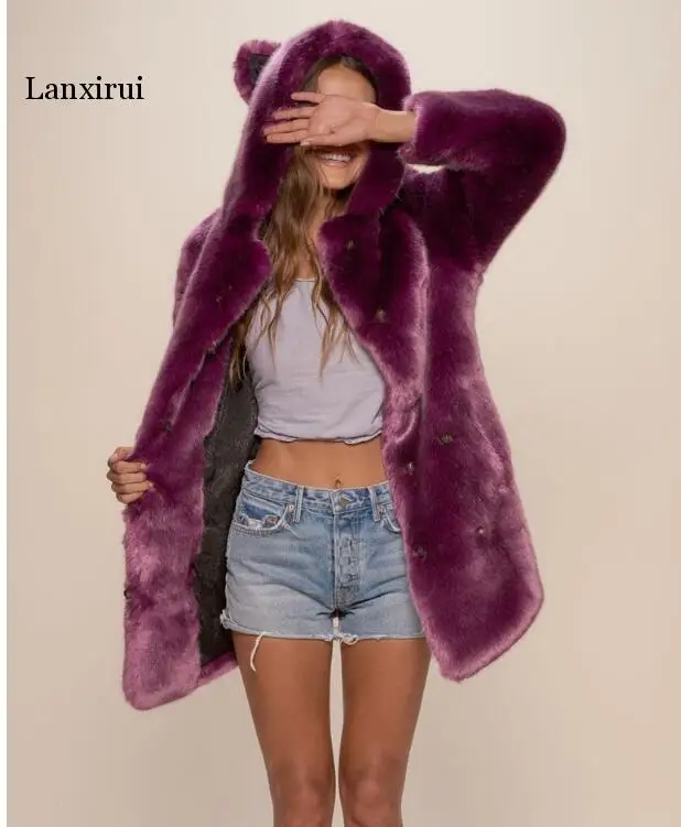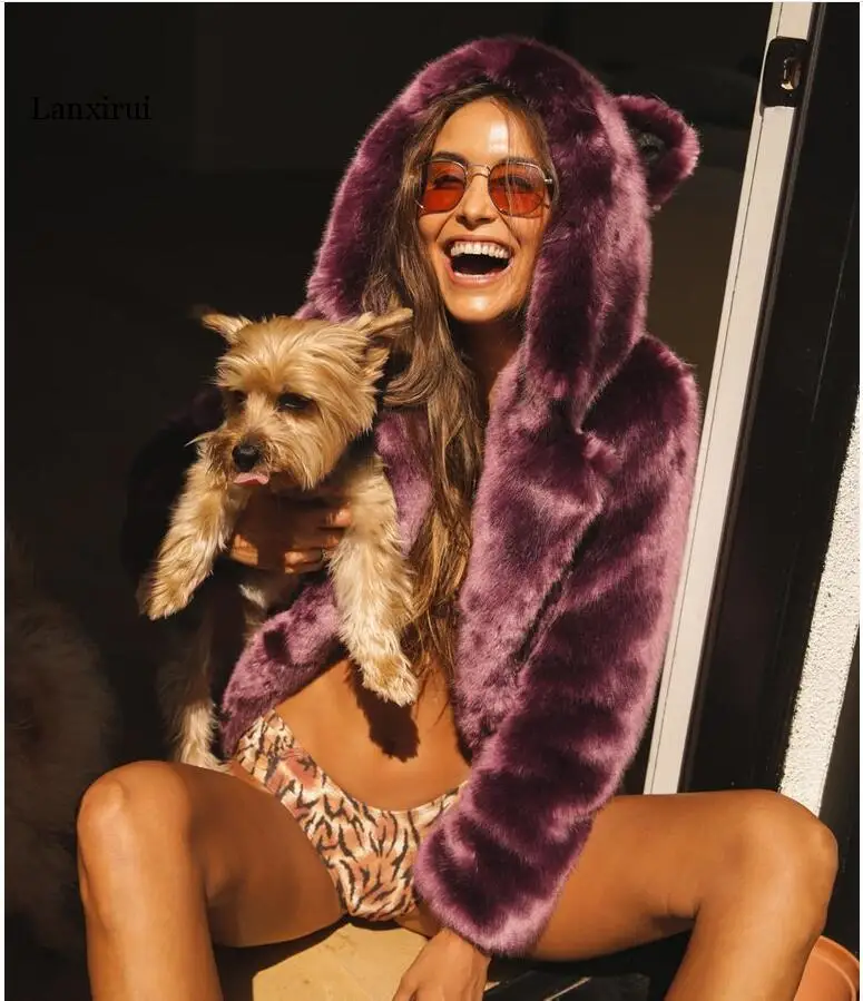 Трендовая новая зимняя одежда с меховым котом, женское теплое пальто из искусственного меха, куртка, однотонная верхняя одежда с капюшоном, Женское пальто